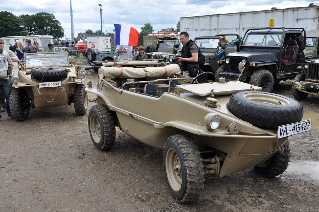En allant vers le parking pour aller manger, nous croisons ce M39 benne, ce Range Rover 6x6, ce Peterbilt 379 de dépannage, ces Schwimmwagen ou cette Kübelwagen dans une inhabituelle livrée.