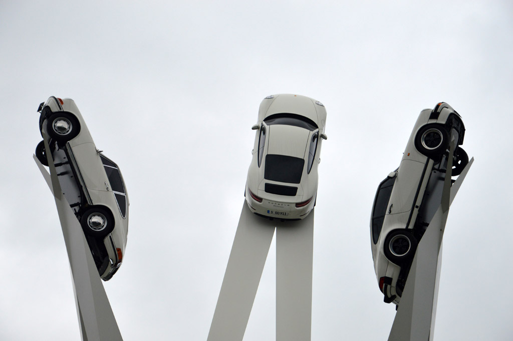 J'arrive par le train régional, dont l'arrêt se situe juste à côté du musée. Autour de la Porscheplatz, on trouve donc le musée, l'unsine, ainsi que la plus grande concession Porche d'Europe. Sur le rond-point central est installée cette impressionante sculpture présentant trois généraions de 911.