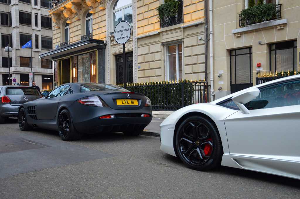 Autre supercar peu courante, cette Mercedes-McLaren SLR équipée d'un film noir mat, accomapgnée d'une Lamborghini Aventador blanc nacré.