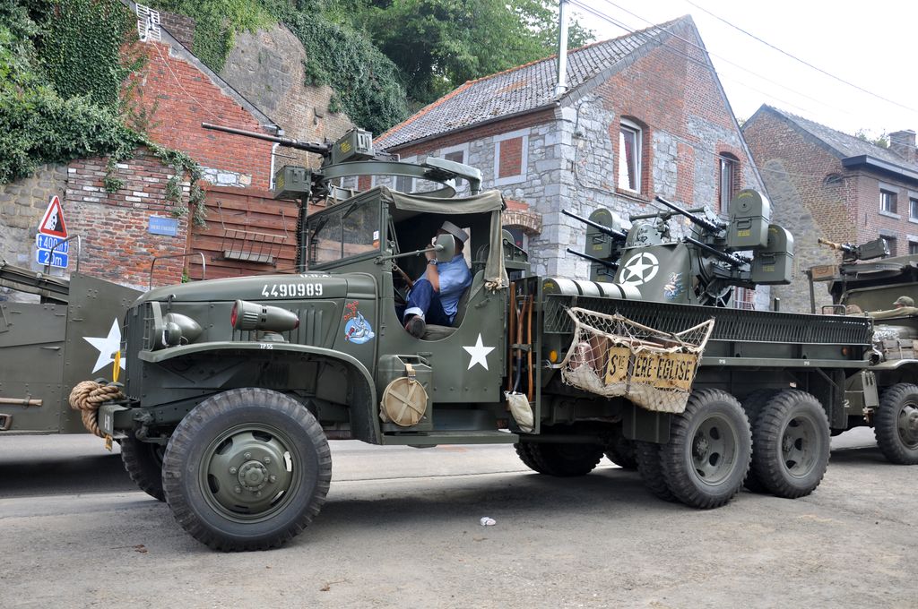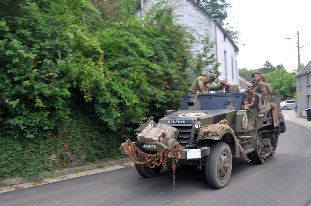 Après renseignement, nous apprenons que les véhicules sont partis en direction de Merbes-le-Château, pour une mise à l'eau des amphibies. Arrivé sur place, nous voyons le dernier véhicule du convoi quitter le lieu. Des passants nous indiquent qu'ils ont pris la direction de Lobbes, et nous les retrouverons en cours de route (enfin une partie, les amphibies étant partis dans une autre direction). On trouvait donc du beau matériel : les habituels Jeep, Dodge et GMC (dont un équipé d'un affût quadruple Maxon, et un autre transportant une Weasel),...