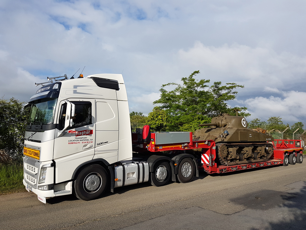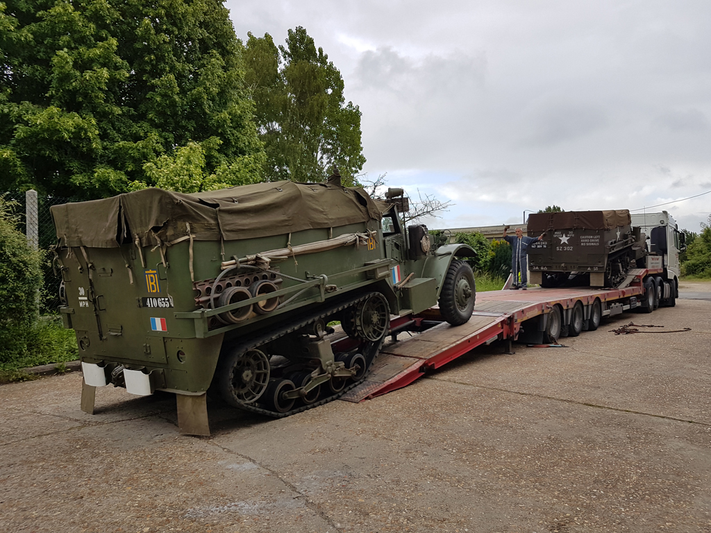 Alors que plusieurs lourds véhicules (GMC CCKW, DUKW et International M426) ont déjà pris la route le lundi 27 juillet, je m'occupe le 28 de charger le Sherman de l'association sur la remorque porte-char qui l'emmènera jusqu'en Normandie, et j'aide à charger les véhicules restants : Half-Track et Scout-Car.