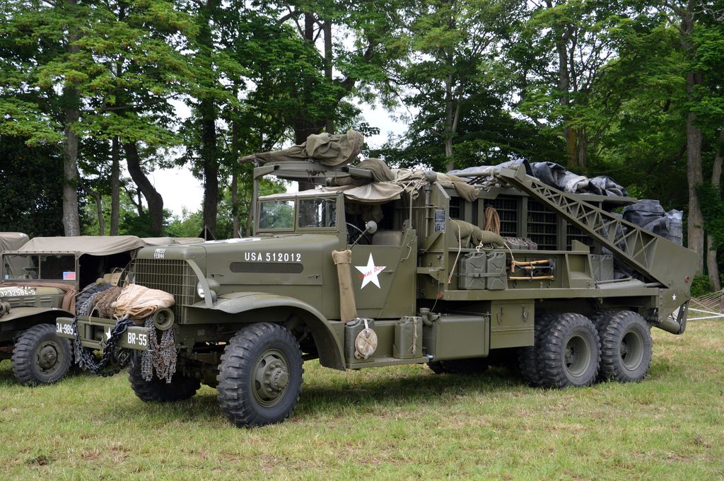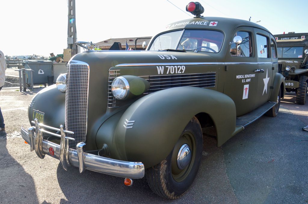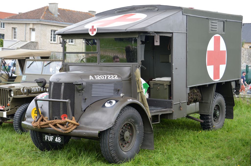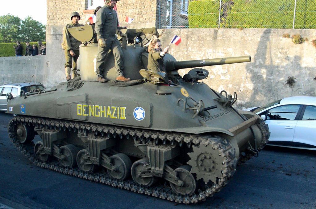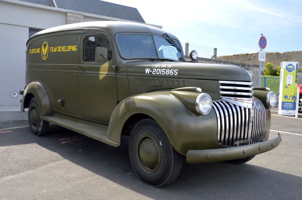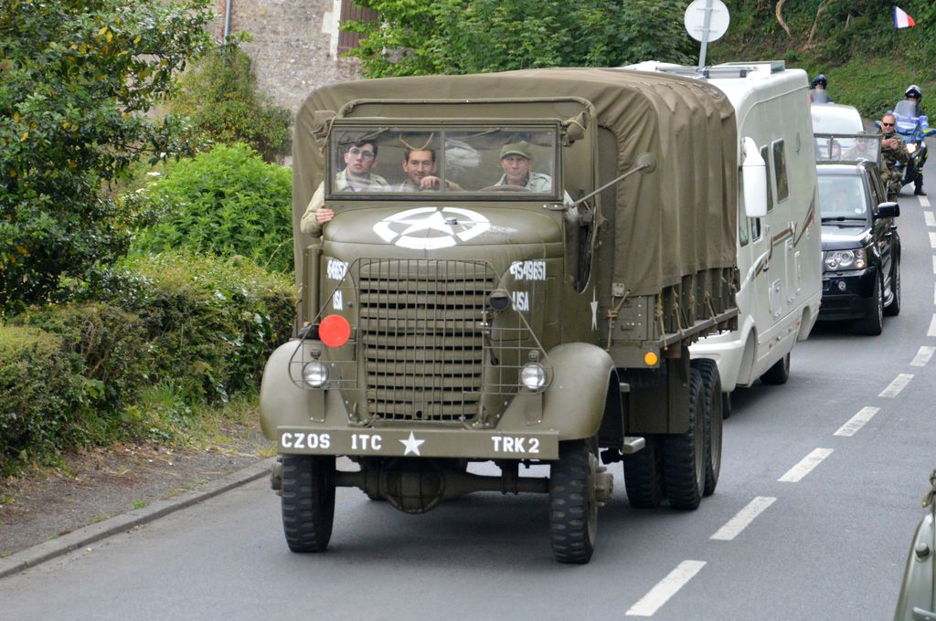 En fin d'après-midi, direction Grandcamp-Maisy où un grand défilé est prévu à partir de 20h30 en direction d'Isigny-sur-Mer. Nous rejoignons les véhicules avant le départ. Beaucoup viennent du camp Geronimo, mais il y en a plusieurs que nous n'avions pas encore vu : M26 Pacific (!), GMC CCKW équipé d'un 40mm Bofors, le Brockway B666 déjà vu avec son portique déplié, une DOdge Staff Car, Dodge WC55, Dodge WC64KD, La Salle ambulance, ou encore cette drôle de conversion de Studebaker US6 en 4x4.