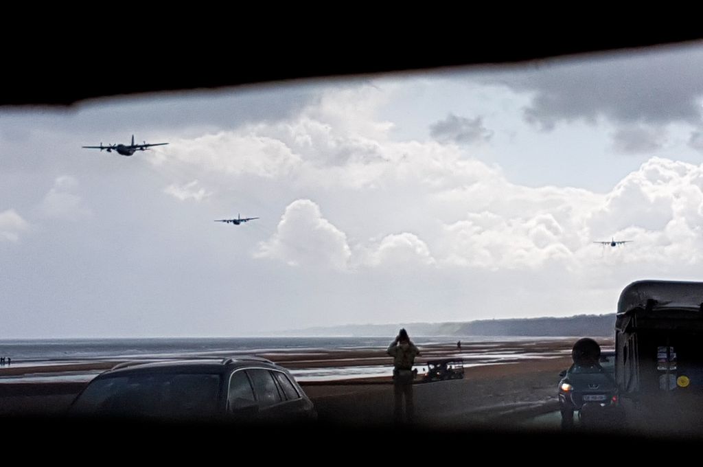Plusieurs bateaux surveillent au loin. Dans les airs, les Black Hawk patrouillent. Sur la plage, je suis tombé sur ce Dodge 1/2 ton venu de... New York. J'ai discuté un moment avec le propriétaire, le camion est venu par bateau et ils passent un moins en Europe à commencer par les plages de Normandie !