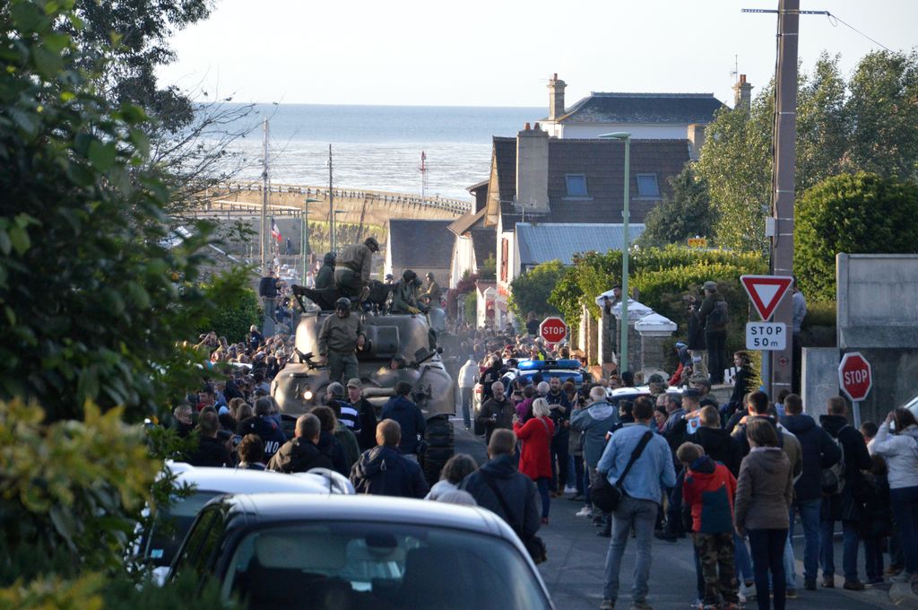 Pour le 6 juin, une grande partie des routes principales sont coupées en Normandie à cause des personnalités politiques qui viennent pour les cérémonies officielles. Pas de soucis, un grand défilé est organisé par l'UNIVEM à Vierville même, le long de la plage. Problème : la route que l'on doit traverser (sur 10 mètres) pour accéder à la route descendant vers le boulevard de la plage est coupée à la circulation à partir de 6h... Qu'à cela ne tienne, tous les véhicules participants au défilé ont traversé la route à partir de 5h du matin pour les mettre en place pour le défilé ! Pour ma part, j'ai descendu le Sherman jusqu'au monument face à Omaha Beach : pas évident de retenir le bestiau de 32 tonnes dans la grande descente de la plage ! Une cérémonie a eu lieu au momument à 6h, puis à 6h30, une chaîne humaine s'est formé sur la plage, avec ensuite un jeté de fleurs dans la mer. Emouvant de se dire que 75 ans plus tôt des hommes ont débarqué ici.