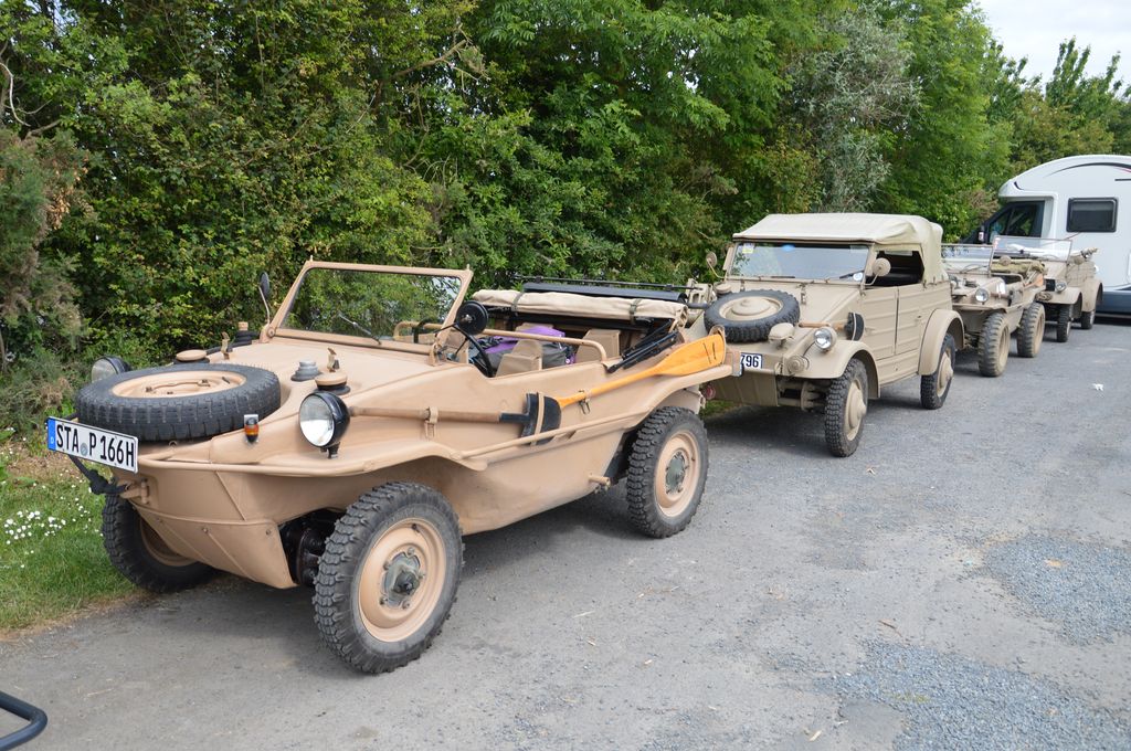 Sur place, un petit convoi allemand composé de plusieurs motos, Kübelwagen et Schwimmwagen. A voir également cette Ford GPA.