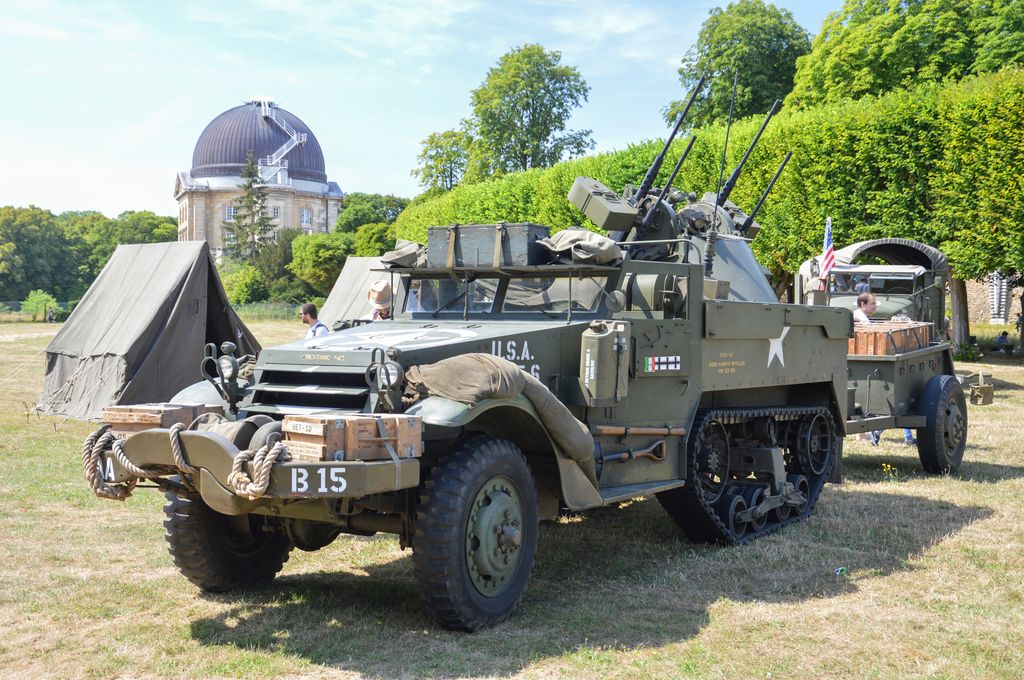 Nouvelle édition pour la Traversée estivale de Paris, organisée par l'association Vincennes en Anciennes. Contrairement à d'habitude, le départ n'était plus donné de l'Esplanade du Château de Vincennes actuellement en travaux, mais depuis le Conservatoire National des Véhicules Anciens d'Anthony. Après un péripleà travers les rues de la capitale, les participants (près de 600 véhicules en tout) se rejoignaient vers midi sur les terrasses de l'observatoire de Meudon. C'est ici que je me rendis, accompagnant l'UNIVEM pour l'installation d'un campement de la 2ème Division Blindée du Général Leclerc dès le matin.