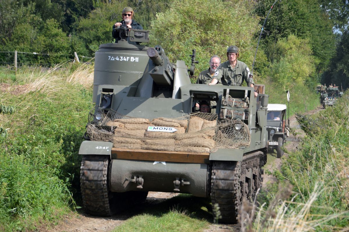 Nous arrivons tôt le matin au site du Bois-Brûlé, où le camp de base est établi, avant que le convoi ne parte pour la journée. A l'entrée, un Bradley de l'Armée Américaine accueille les visiteurs. En poursuivant dans le camp, on tombe sur les autres chars : Sherman M4A1/Grizzly "Ô Saint-Georges" et Stuart M5A1 "Fish'n'Chips" de la ville de Mons ou encore ces M24 Chaffee et M18 Hellcat de collectionneurs privés. Un M10 Achilles était également à voir, mais resté bâché, il ne sortira pas de la journée.