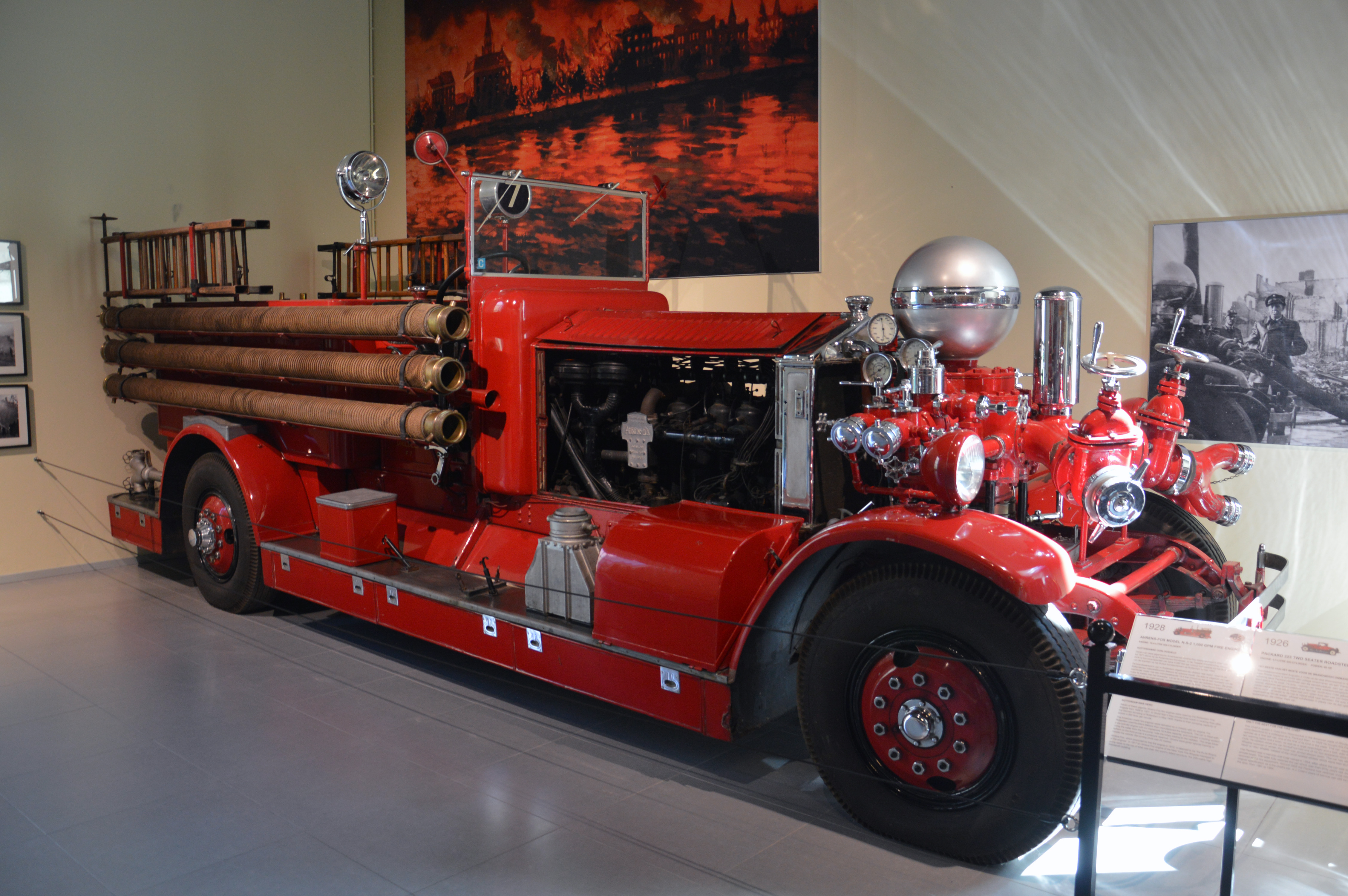 Une partie consacrée aux véhicules de pompier : American La France de 1922, Packard 223 ou Ahrens-Fox Model N-S-2.