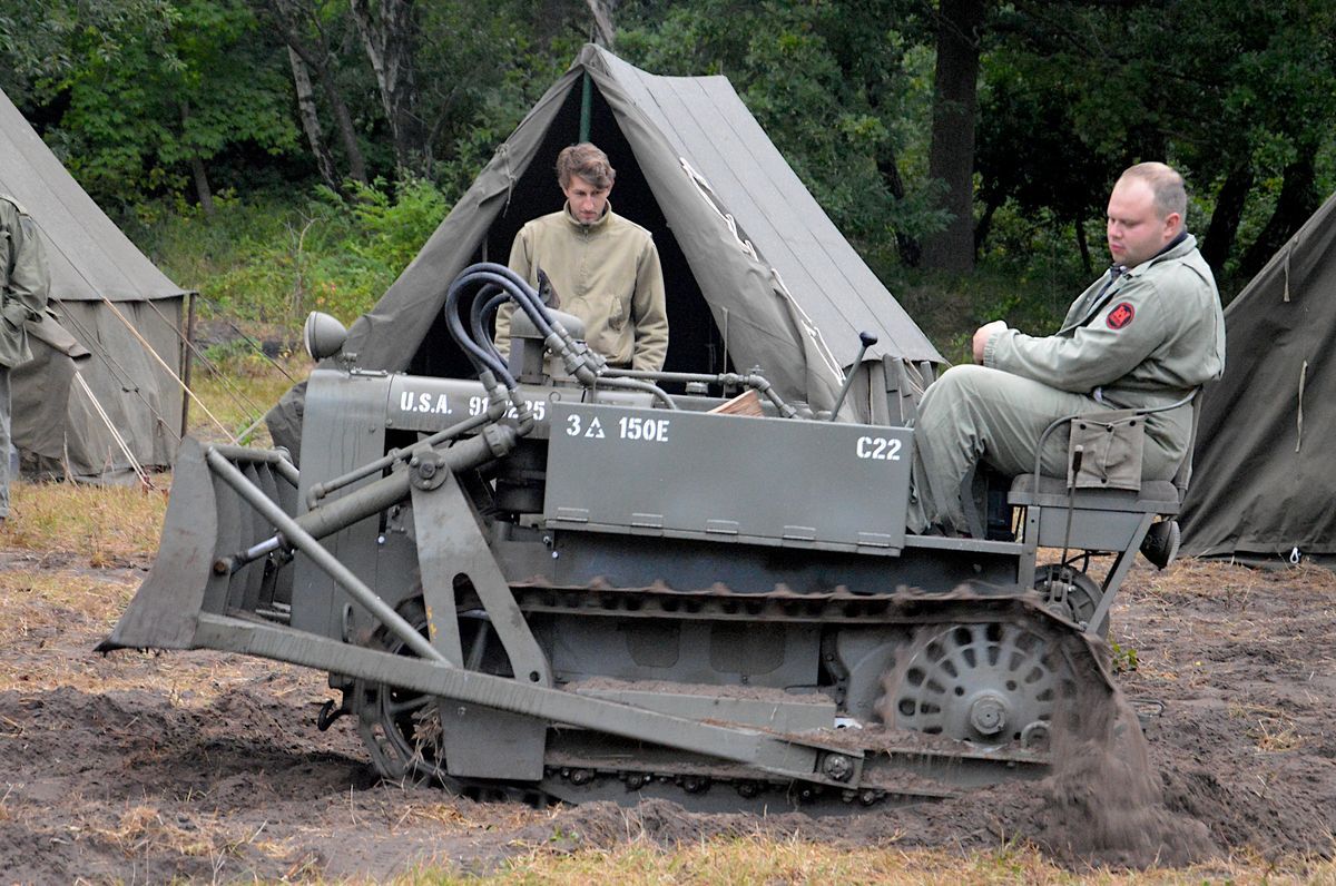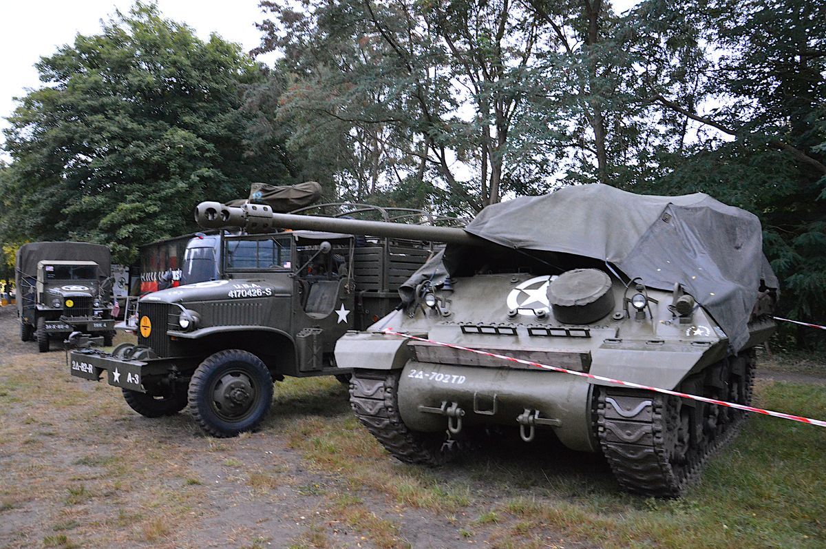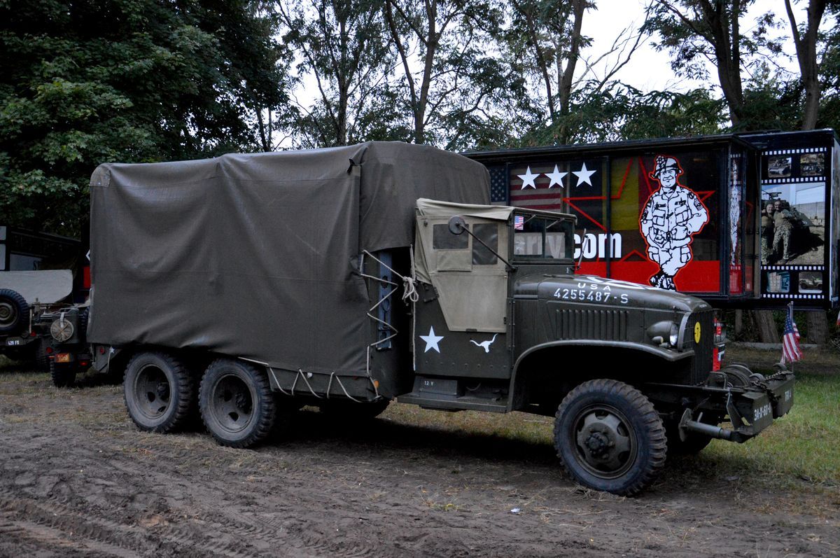 A l'entrée du camp, quelques véhicules de la Seconde guerre mondiale sont présents : un Achilles britannique aux couleurs US, un rarissime Autocar U-5044T ainsi qu'un rare GMC CCKW-353 atelier du génie. Ces véhicules sont entourés de banderoles et ne participeront visiblement pas au défilé.