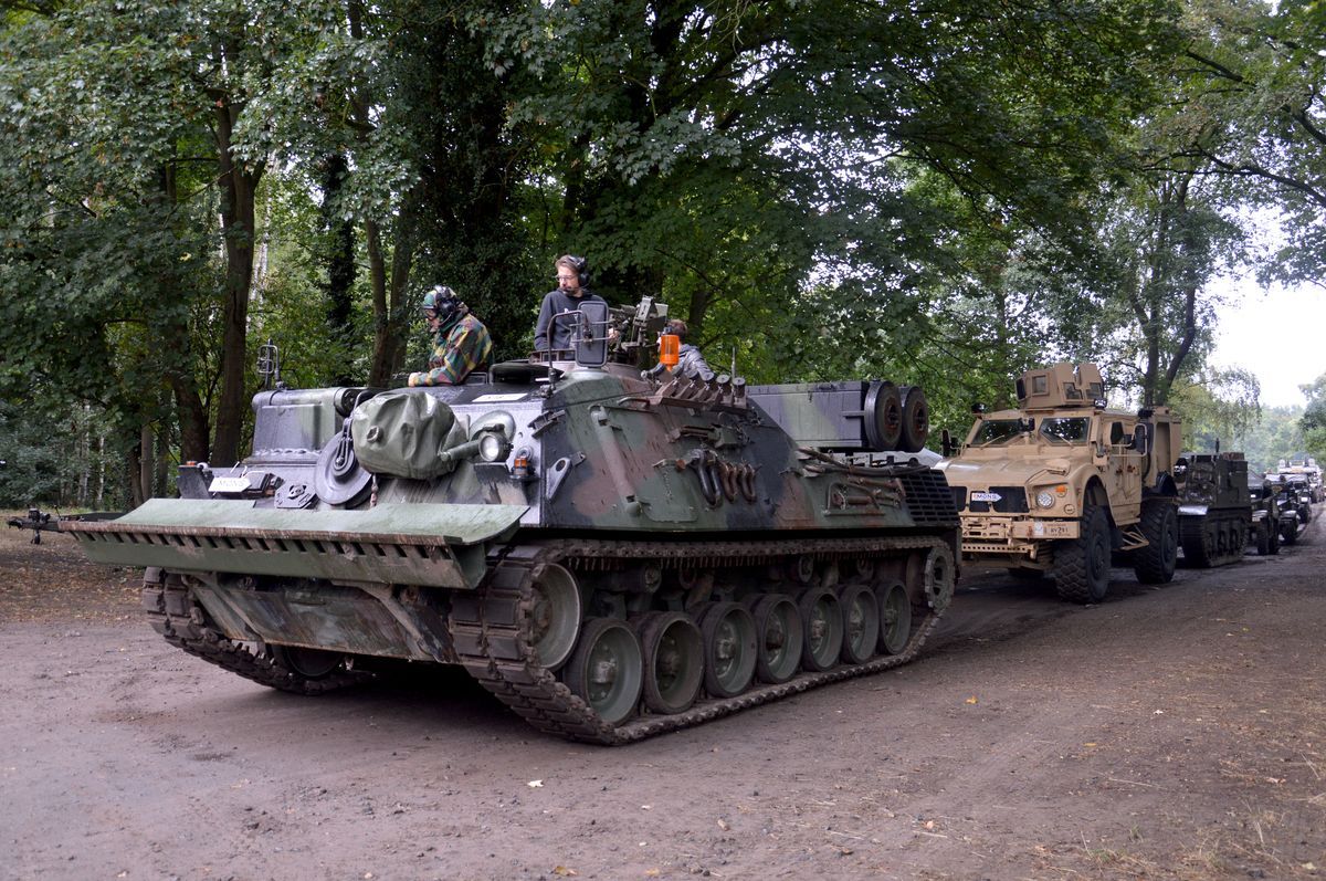 Formation de la colonne juste avant le départ : un Bergeleopard, un MRAP, un Priest et c'est tout pour les gros blindés, ensuite les Half-Track suivent ! Probalement la pire colonne que l'évènement ait connu... Le Stuart part sur porte-char et le Sherman Ô Saint-Georges habituel doit probablement déjà être sur une étape prochaine du parcours....