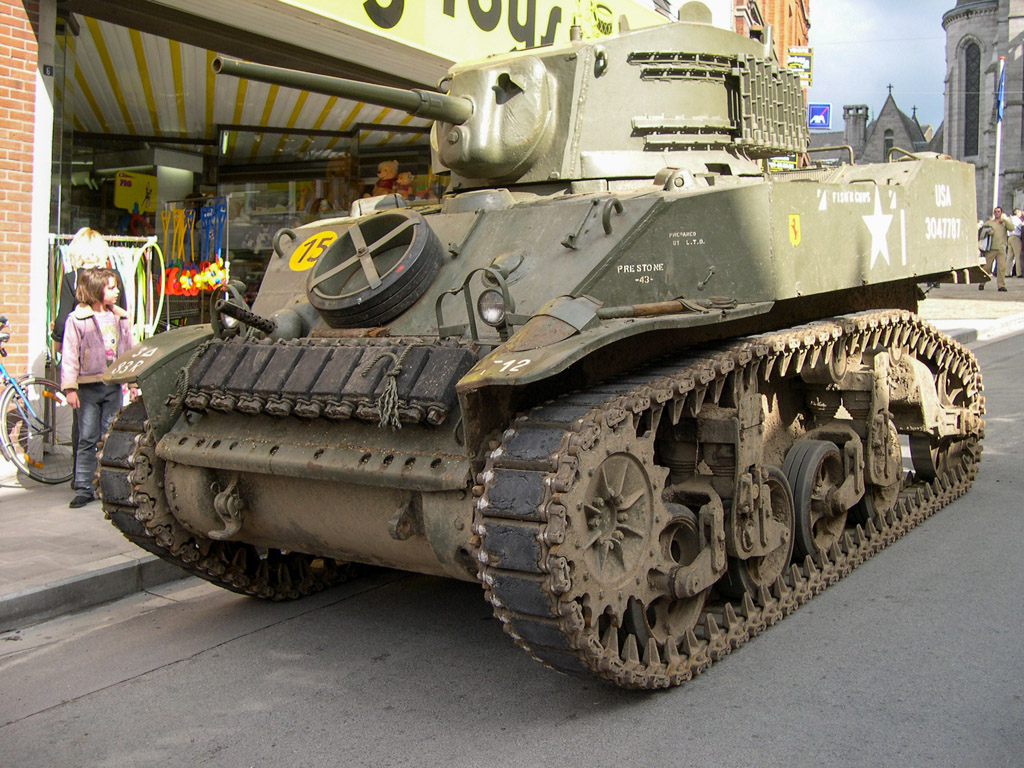 De retour à Bon-Secours, nous voyons les troupes allemandes s'installer dans le centre-ville pour la préparation à la reconstitution de bataille. Et surprise, un char américain débarque également : le Stuart du Royal Auto Club de Mons.