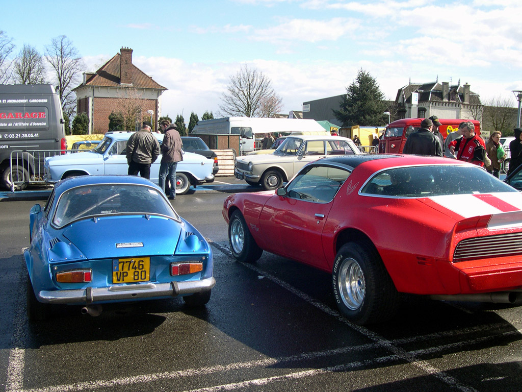 Et des Renault : R5 Turbo 2, un alignement de Frégate, ou cette Alpine A110, qui paraît minuscule à côté de cette Pontiac Firebird.