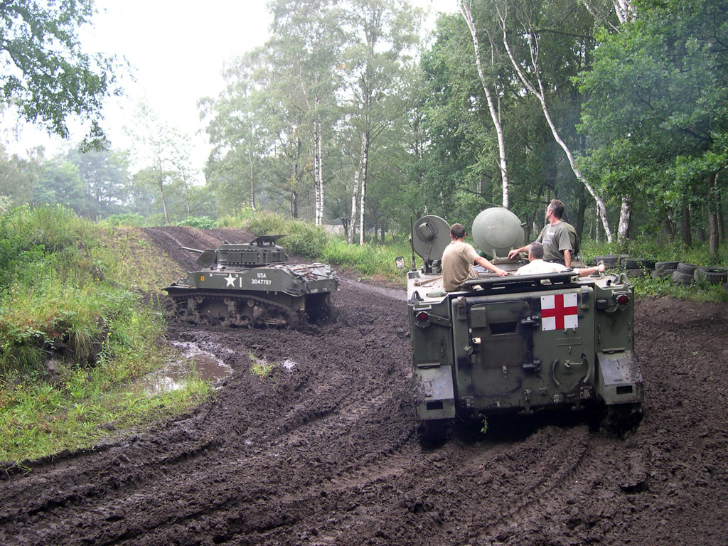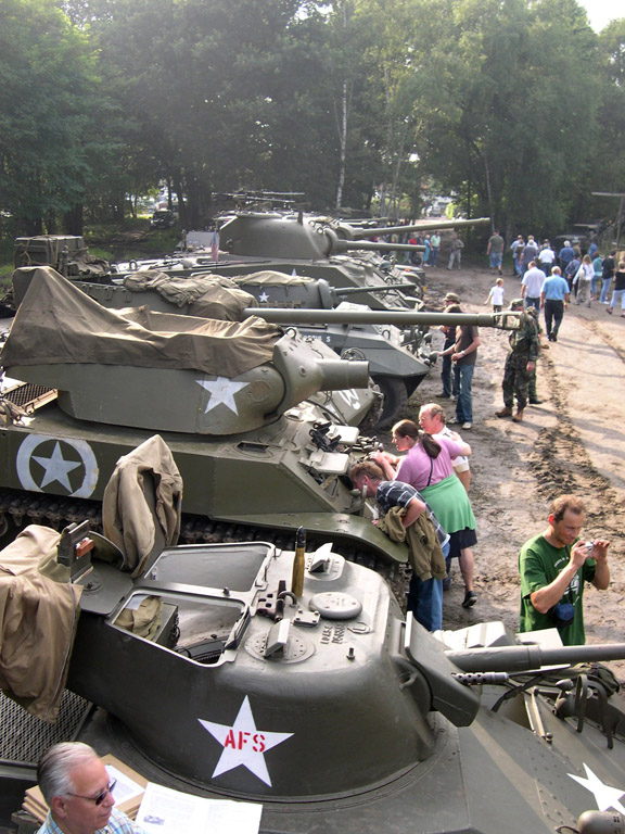 Arrivé au matin, nous commençons la visite du camp de bonne heure. Plusieurs blindés sont déjà présents : Sherman M4A4, les Sherman "Ô Saint-Georges" et Stuart M5A1 "Fish and Chips" du Royal Auto Club de Mons, Sherman M4 105mm et M22 Locust du Musée de Bruxelles ou cet alignement de Half-tracks et Scout-cars.