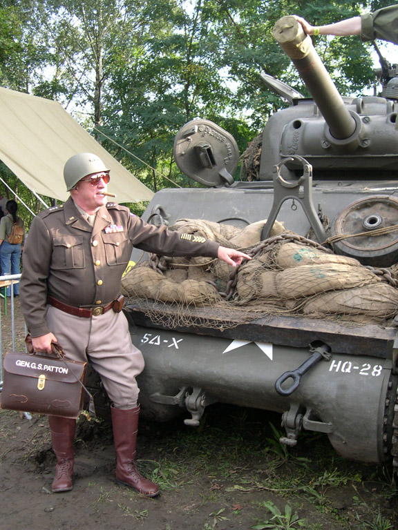 Ce reconstitueur en tenue de Patton pose à côté d'un Sherman. Ces M8 Stuart et M24 Chaffee arriveront en début de soirée.