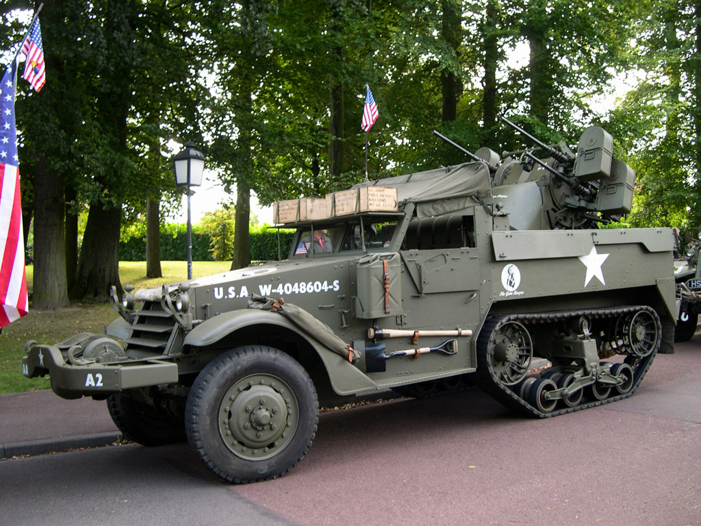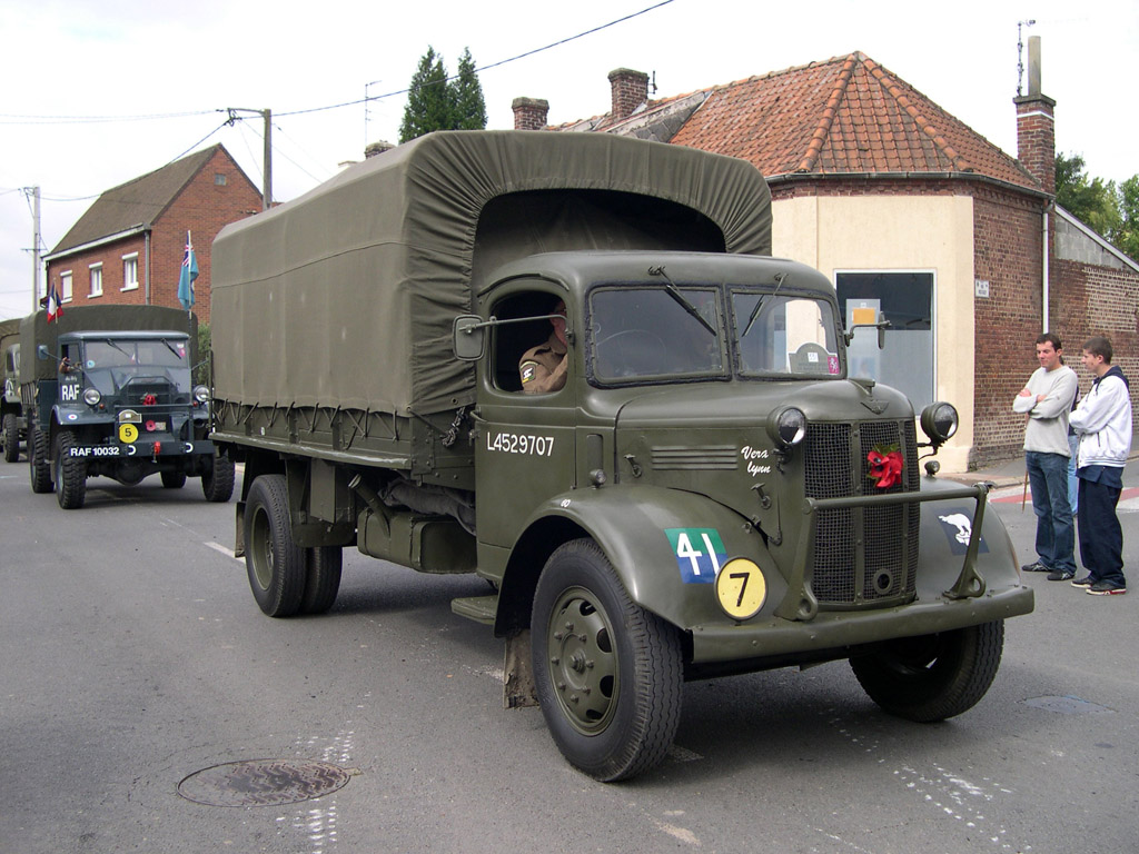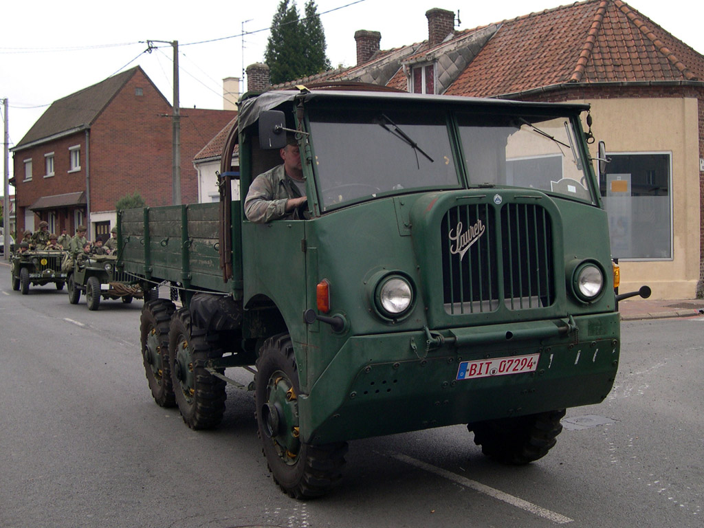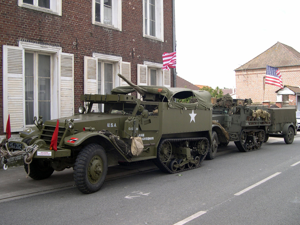 Comme l'année dernière, le vendredi, nous partons à la rencontre du convoi anglais venant de traverser la Manche et en route pour leur campement situé à Beuvry. Leur première étape les fera passer par Longuenesse. L'occasion d'avoir une première vue des véhicules présents cette année : GMC CCKW 353, Half-Track M16 antiaérien, Austin Champ,...