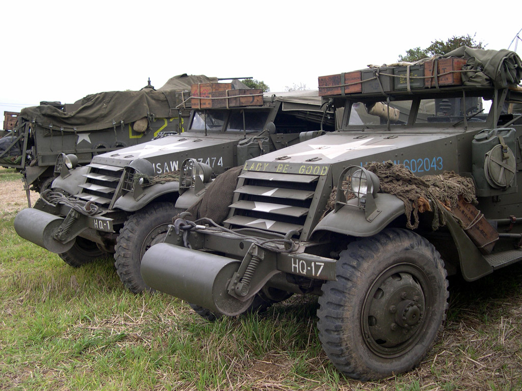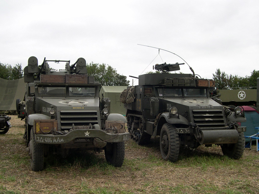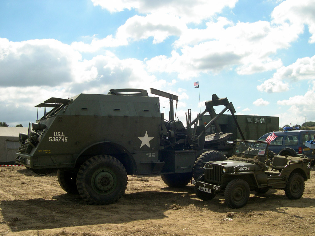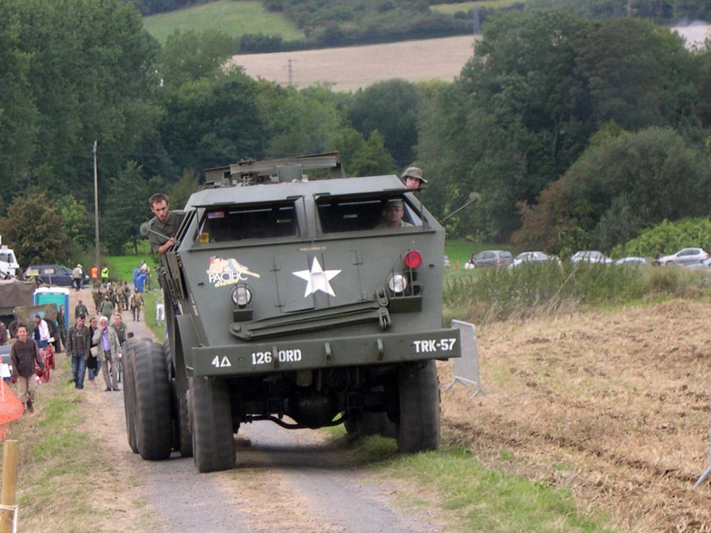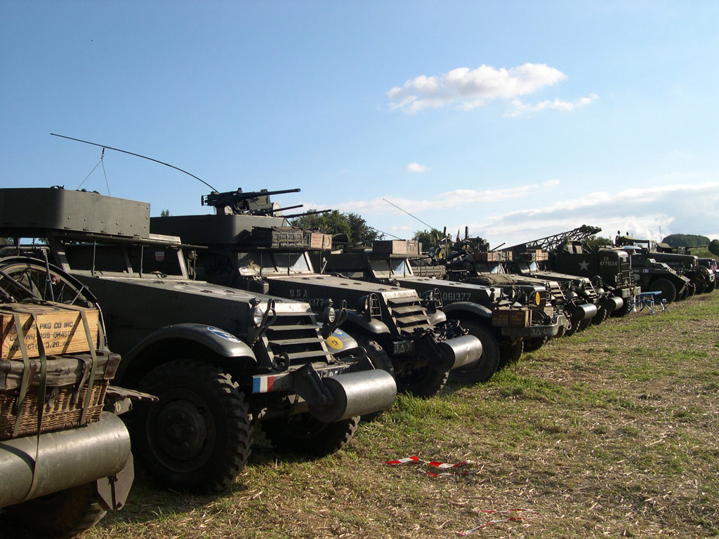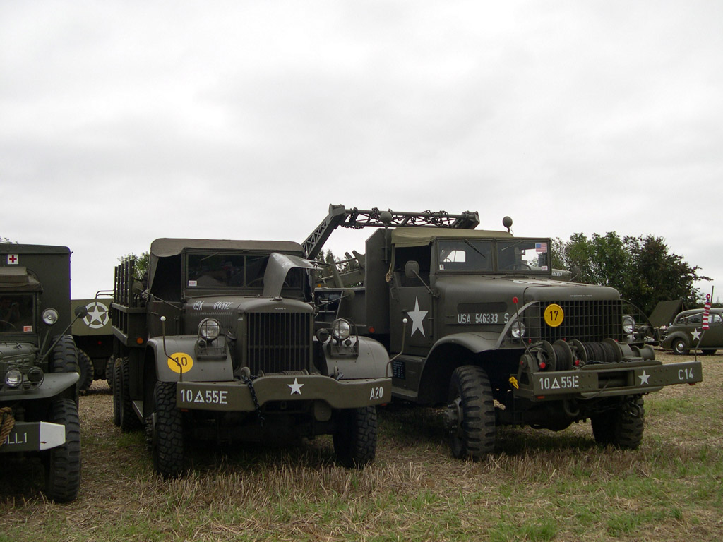 En haut du champ, le BMVT y a installé ses tentes. On peut dire qu'ils ne sont pas venus de Belgique les mains vides : GMC lot 7 monté en double à l'avant et équipé d'une chèvre de levage, plusieurs Scout-Car et Half-Track, Diamond T 968 ou White 666.