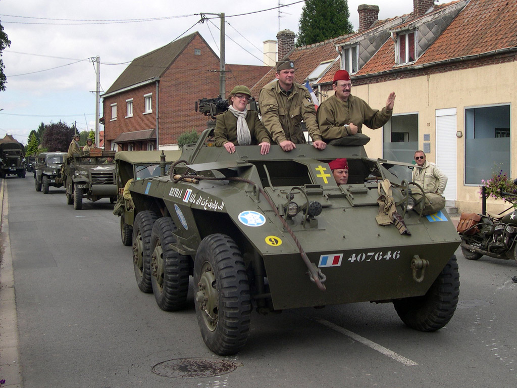 La suite du voyage les conduira à Saint-Hilaire-Cottes. Il y a vraiment des véhicules atypiques qui composent le convoi : Austin K3, Humber Snipe saloon, Chevrolet Ute, duo de Half-Track M5 ou Dodge WC41.