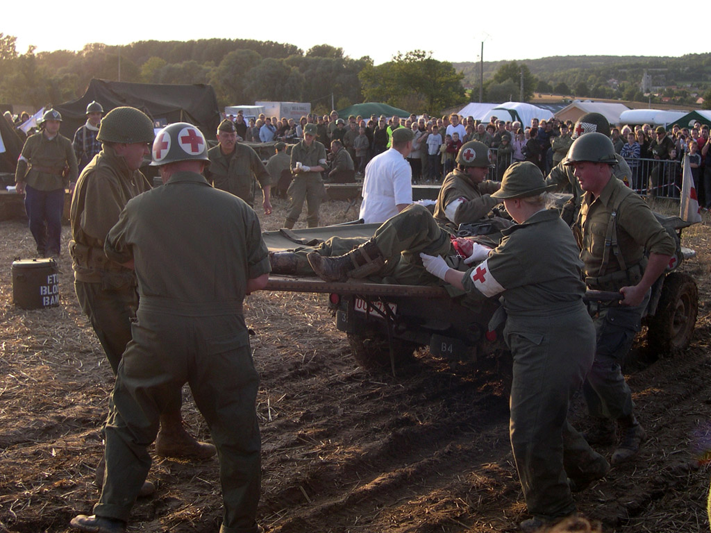 Le samedi, en fin d'après-midi, nous profitons d'une éclaircie pour retourner sur le camp. Le champ est détrempé et la boue s'est inscrustée partout. L'effet de réalisme n'est donc qu'accentué pour la reconstitution d'un poste de premier secours et le ballet continuel de Jeep ambulance.