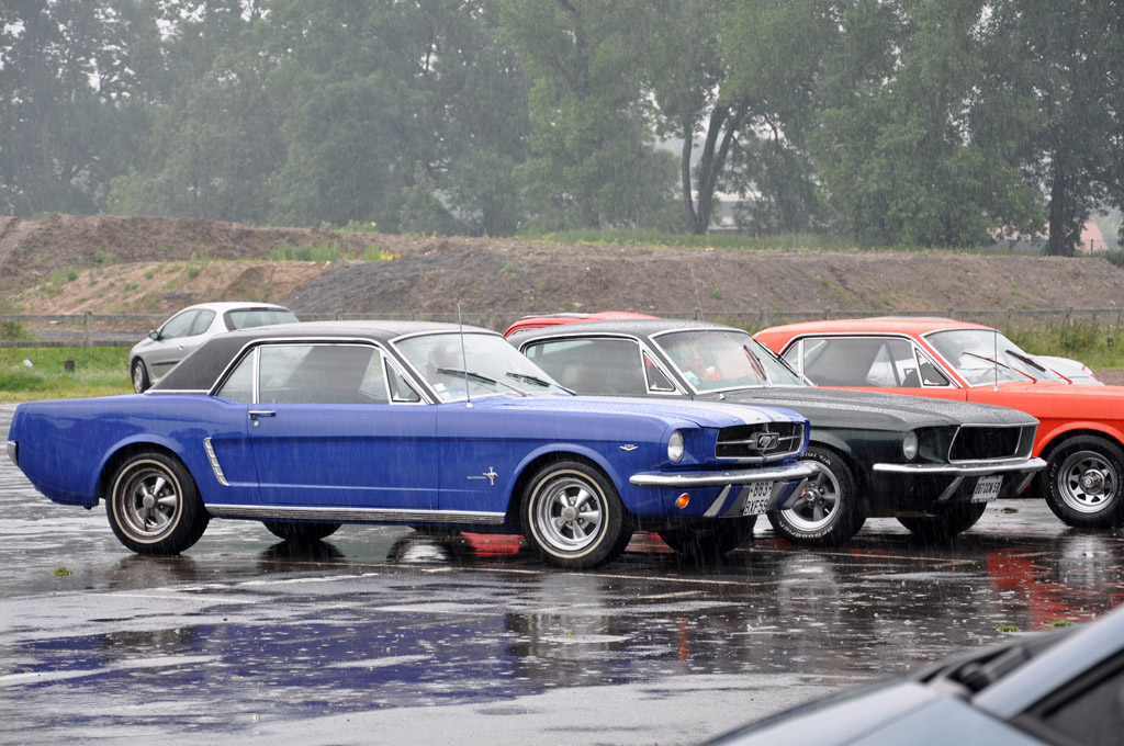 Il pleut des cordes lorsque nous arrivons sur place. Néanmoins quelques Mustang sont là. Avec une propulsion et un gros V8, ça ne doit pas être ce qu'il y a de mieux comme voitures pour rouler sous un temps pareil.