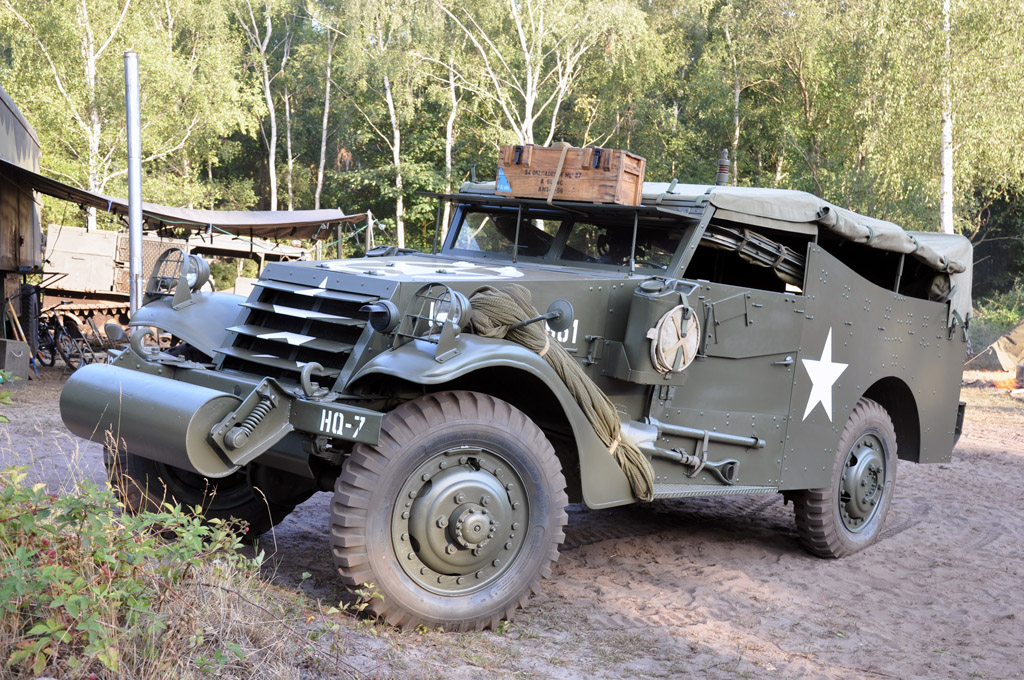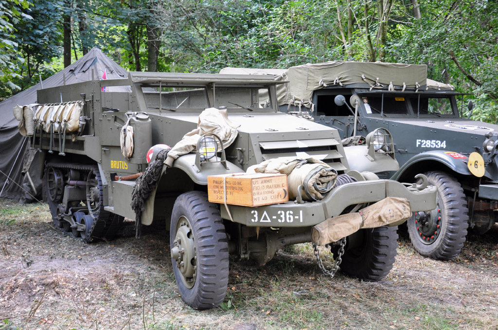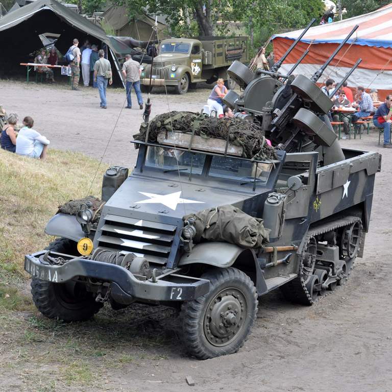 De nombreux véhicules blindés à roues étaient également présents : Ford M8 / M20, Chevrolet T17 Staghound, Daimler Armored Car, Scout car ou Half-Track, dont ce rare M16 antiaérien.