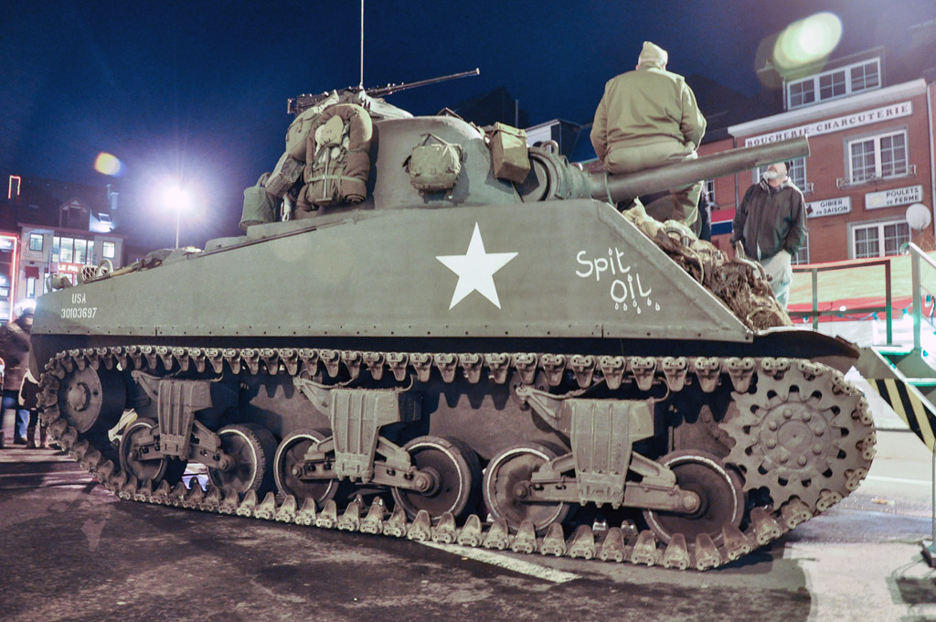 Arrivé en centre-ville de Bastogne au petit matin, nous nous attardons sur ce Sherman M4A3 placé en monument sur la place centrale.