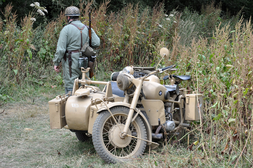 Après avoir assisté à une scène de reconstitution de bataille entre des parchutistes anglais et des allemands, type opération Market Garden, nouveau passage par les reconstitueurs avec cette BMW R75 ou ces Jeep SAS.