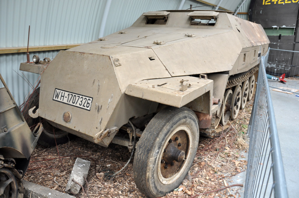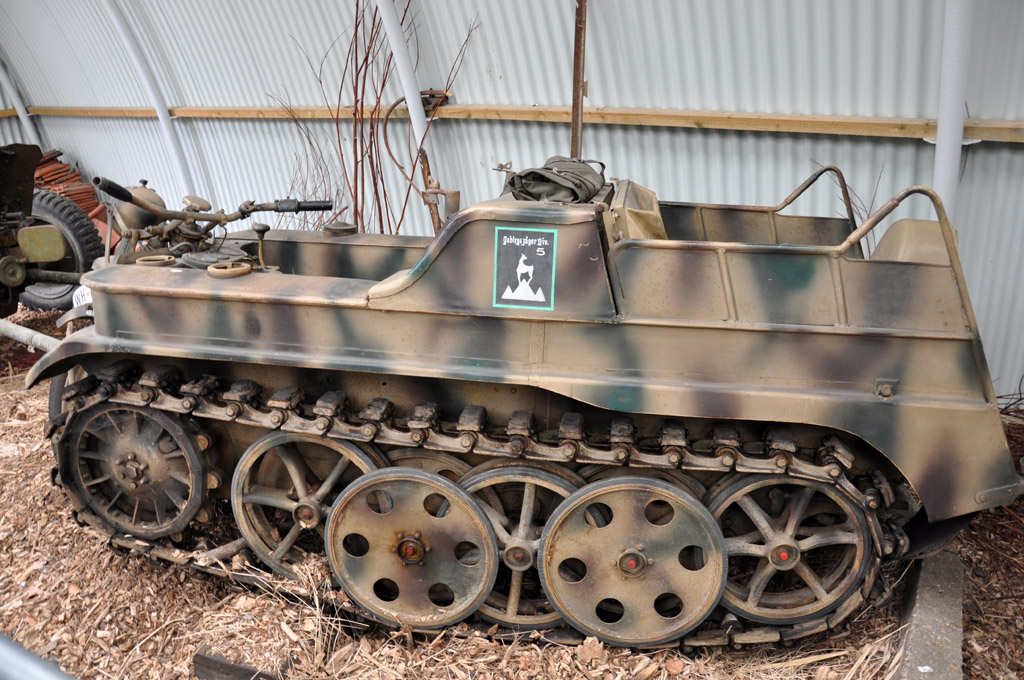 A l'extérieur, deux hangars abritent d'autres véhicules. Dans le premier, on retrouve les véhicules allemands : Panzer 38(t) (en fait un Stridsvagn m/41 passé par la Suède déguisé pour ressembler à un char allemand), Sd.Kfz 251, Opel Blitz ou Kettenkrad !