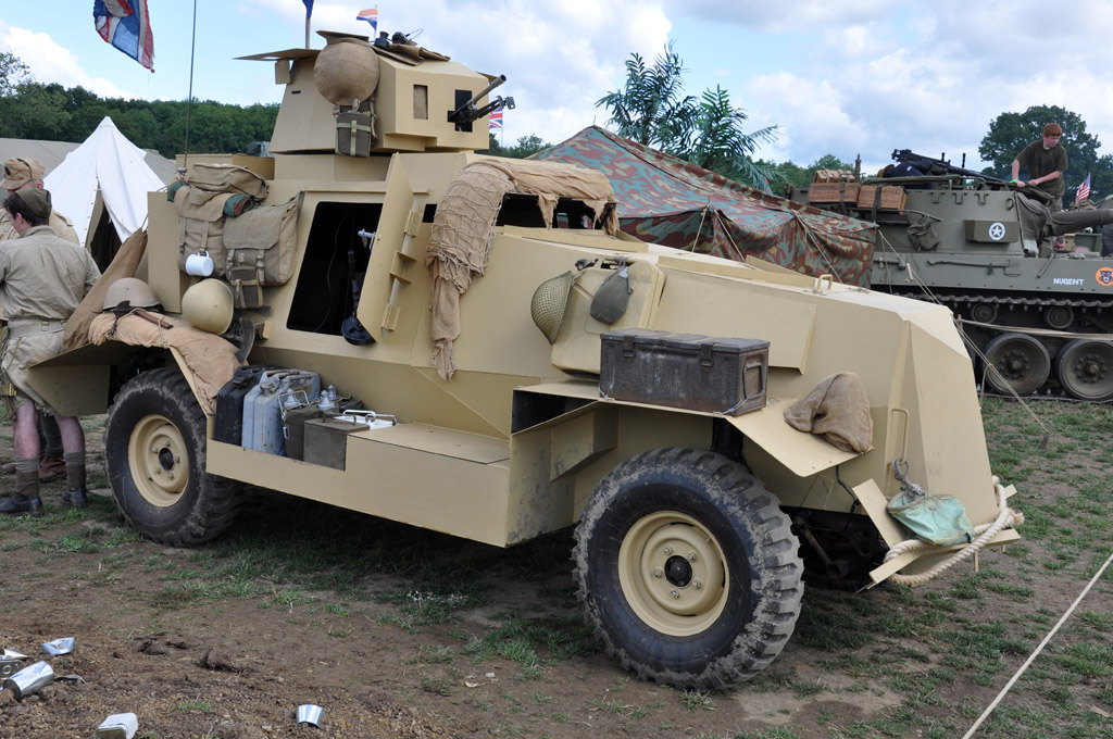 A mesure que l'on avance, on continue de tomber sur des véhicules du Commonwealth peu courants : un Bren Carrier australien, Ford F30 et F60, Daimler Dingo équipée d'une tourelle, ce Sherman BARV ou cette réplique d'automitrailleuse Marmon Herrington.