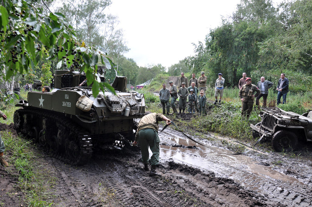 En continuant dans le clairière, on tombe sur d'autres blindés et gros véhicules : deux Sherman Grizzly aux couleurs américaines afin de ressembler au M4A1, Ford M20 ou tracteur d'artillerie M5 International.