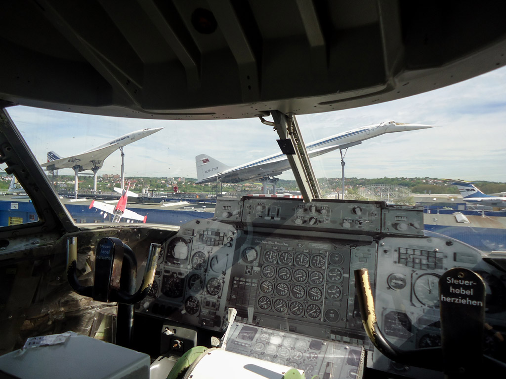 Depuis ce hall, il est également possible d'accéder au toit pour accéder à quelques avions. Ici depuis un cockpit, on peut observer deux des stars du musée : un Concorde et un Tupolev Tu-144.