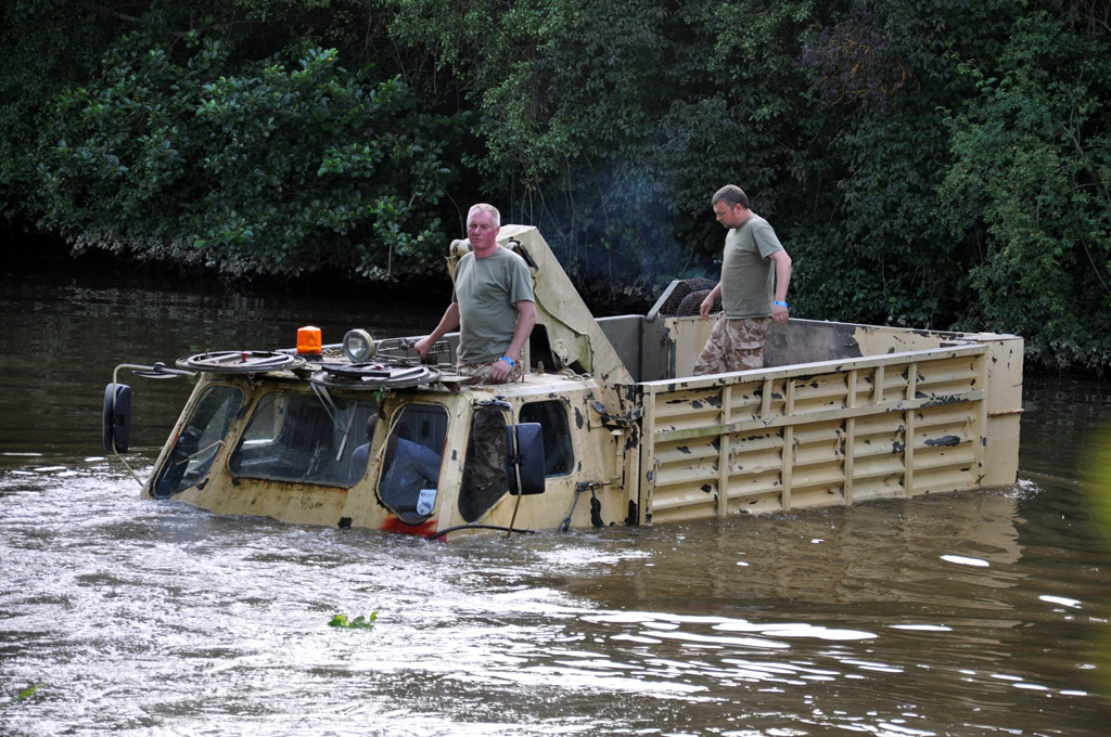 A un moment, un son de moteur attira notre attention, et nous vimes au loin une foule de curieux rassemblés au bord d'un bois. Lorsque nous nous approchèrent, un petit cours d'eau était en contre bas, et dedans, un Alvis Stalwart luttait pour en sortir ! Heureusement un Scammel Explorer viendra à sa rescousse.