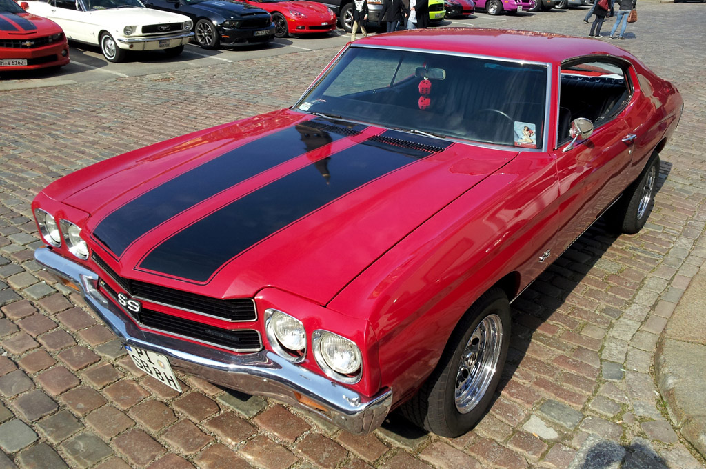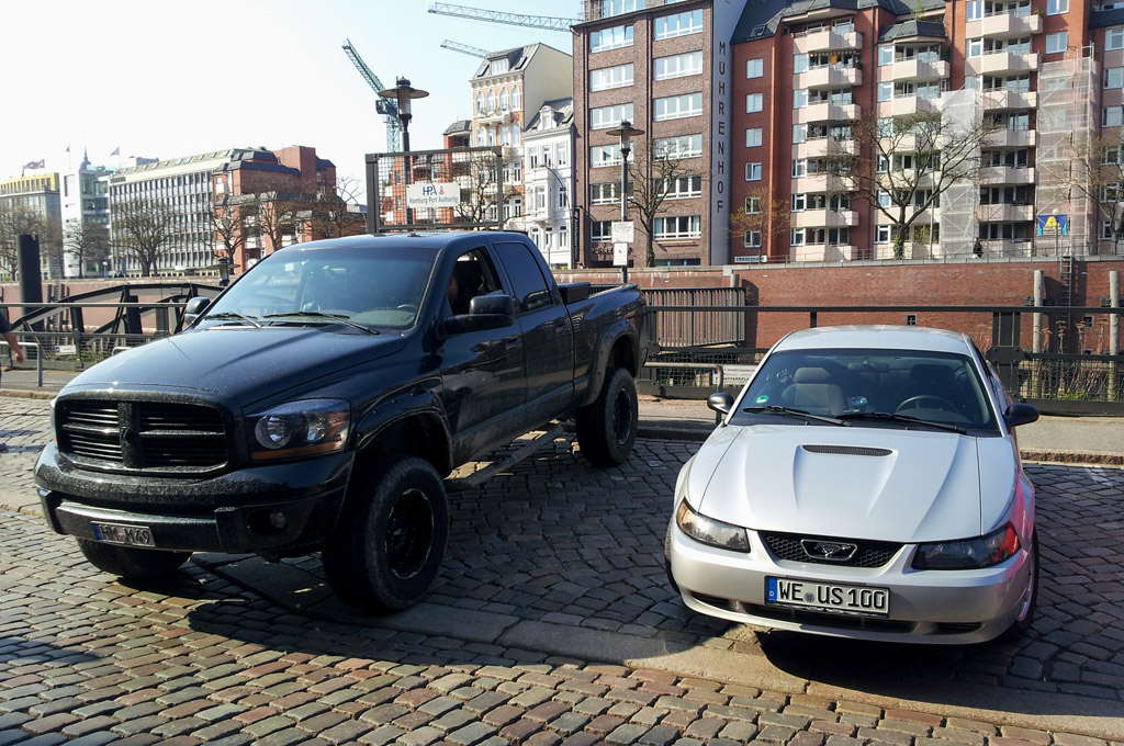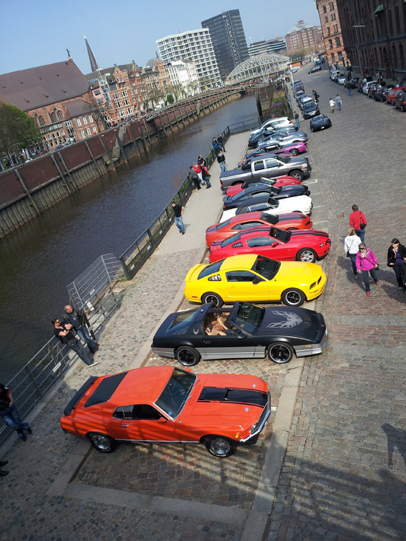En revenant de l'Autohaus Ruprich, je suis repassé par le quartier d'Hafencity pour assister au Crusing Treffen, rencart mensuel qui réunit plusieurs propriétaires d'américaines pour ensuite effectuer une balade dans la ville. On y retrouvait principalement de nombreuses Mustang, Camaro et Corvette, anciennes et modernes.