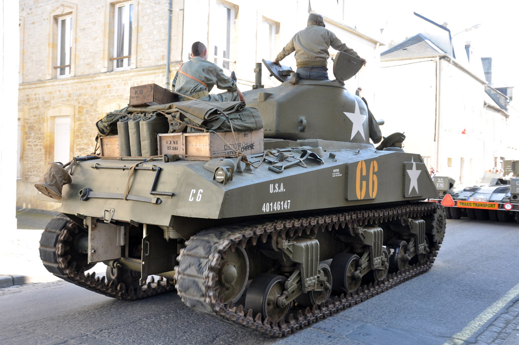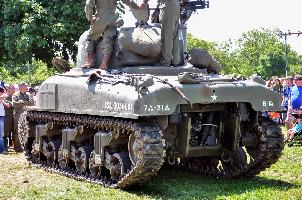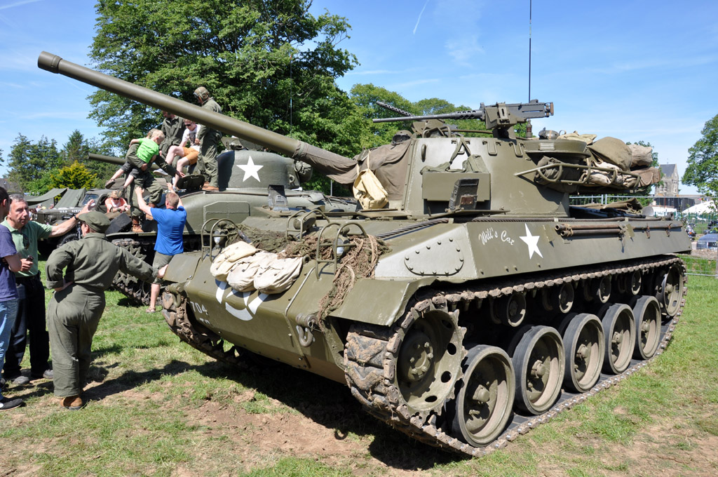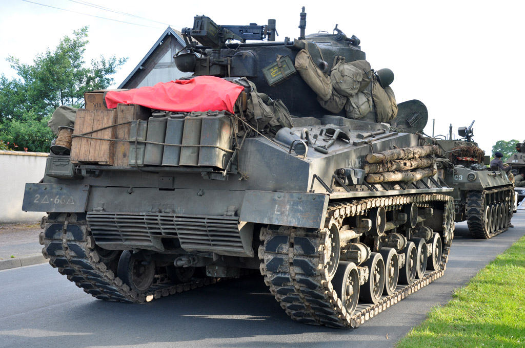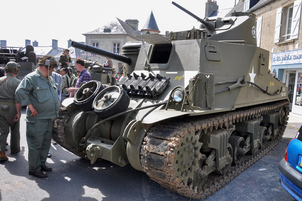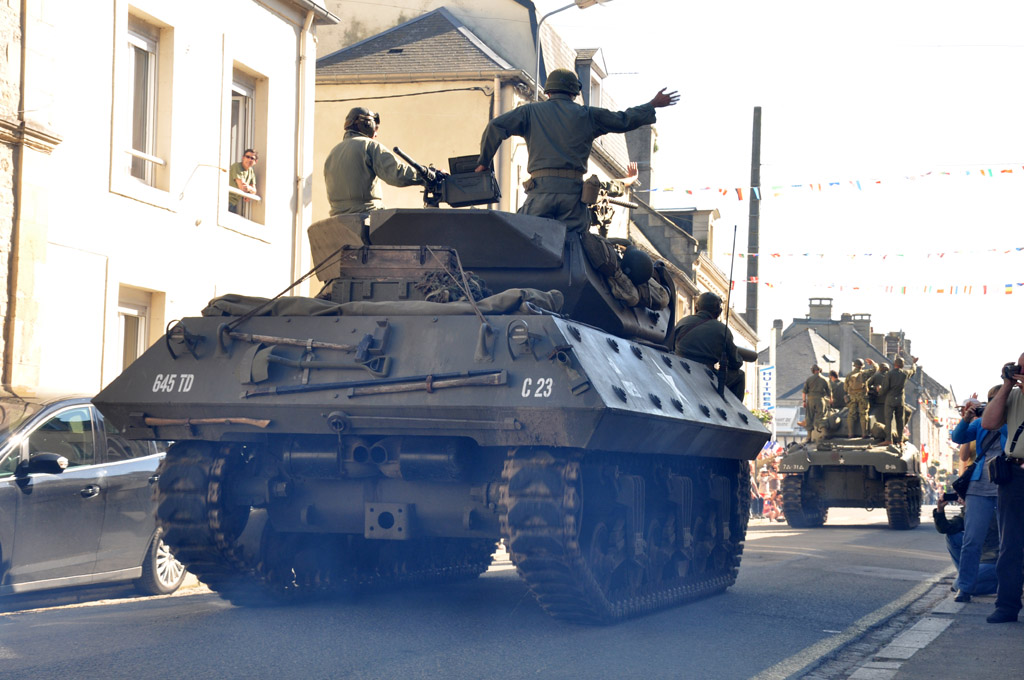 Nous nous rendons ensuite à Sainte-Mère-Eglise où se tient le grand campement du MVCG France. De nombreux blindés y sont exposés : Stuart M3A1, le Sherman M4 76mm HVSS "Fury" ayant été la doublure du char officiel sur le tournage du film éponyme, Sherman M4A1 (en fait un Grizzly), M18 Hellcat et M10 Destroyer.