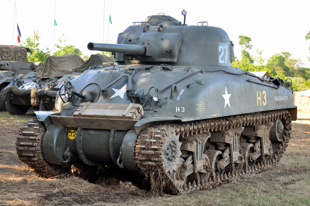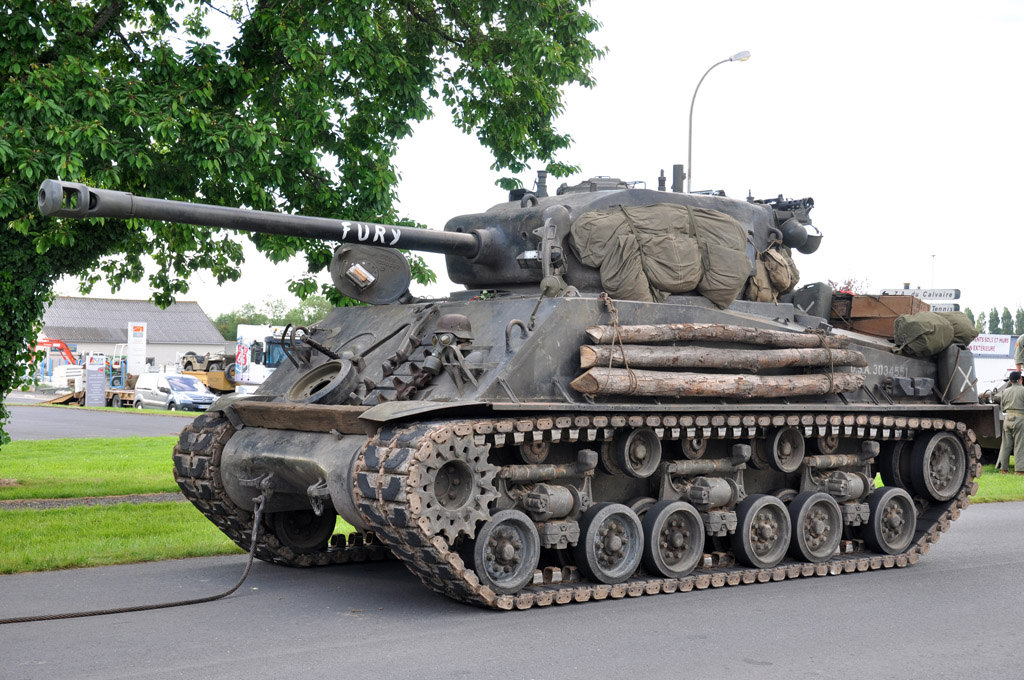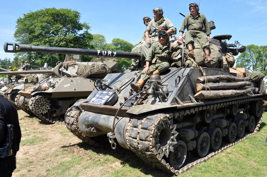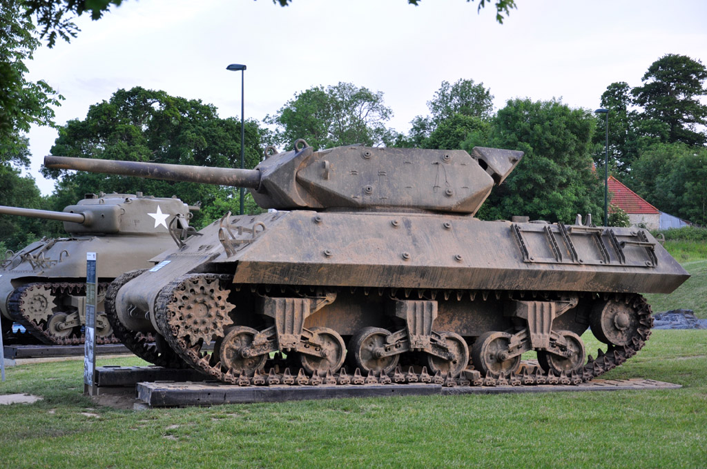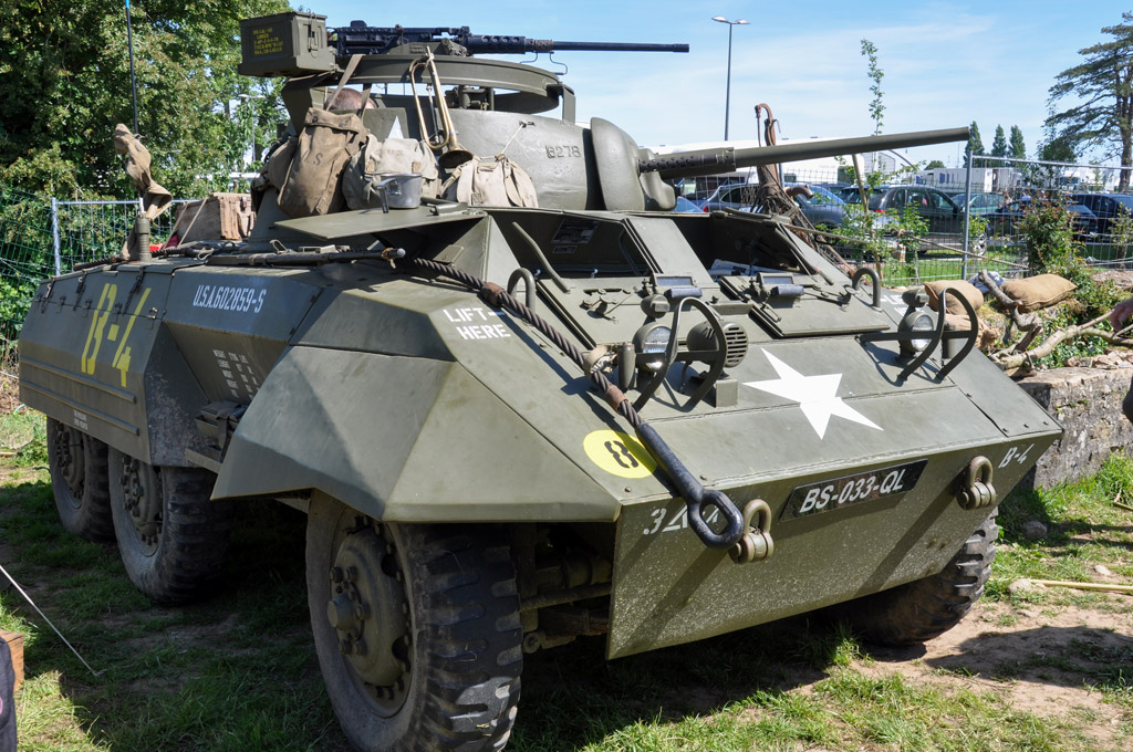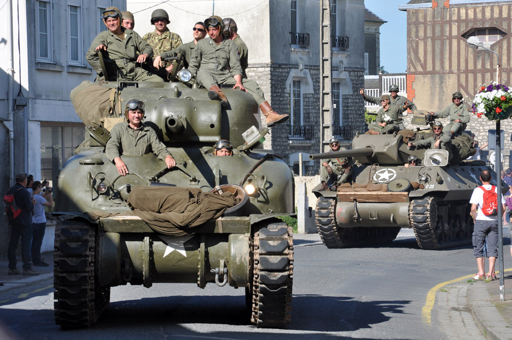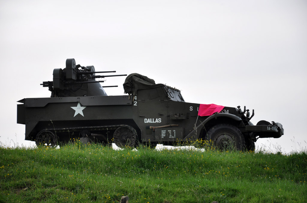 Nous nous rendons ensuite à Sainte-Mère-Eglise où se tient le grand campement du MVCG France. De nombreux blindés y sont exposés : Stuart M3A1, le Sherman M4 76mm HVSS "Fury" ayant été la doublure du char officiel sur le tournage du film éponyme, Sherman M4A1 (en fait un Grizzly), M18 Hellcat et M10 Destroyer.