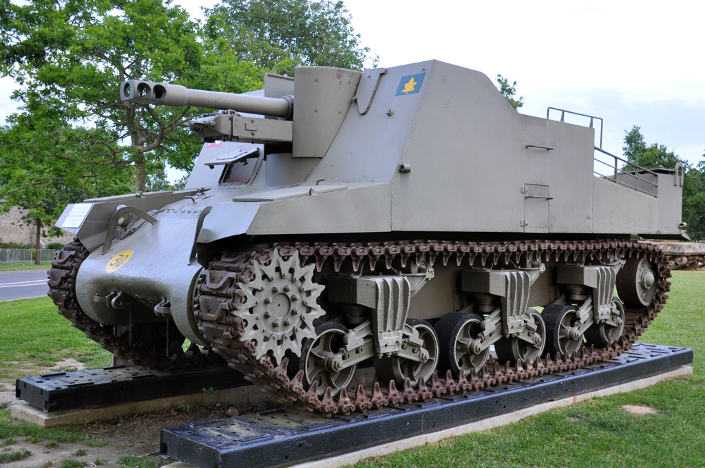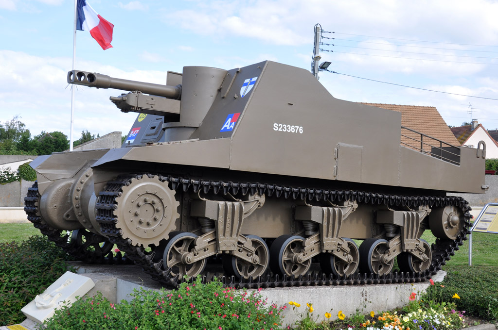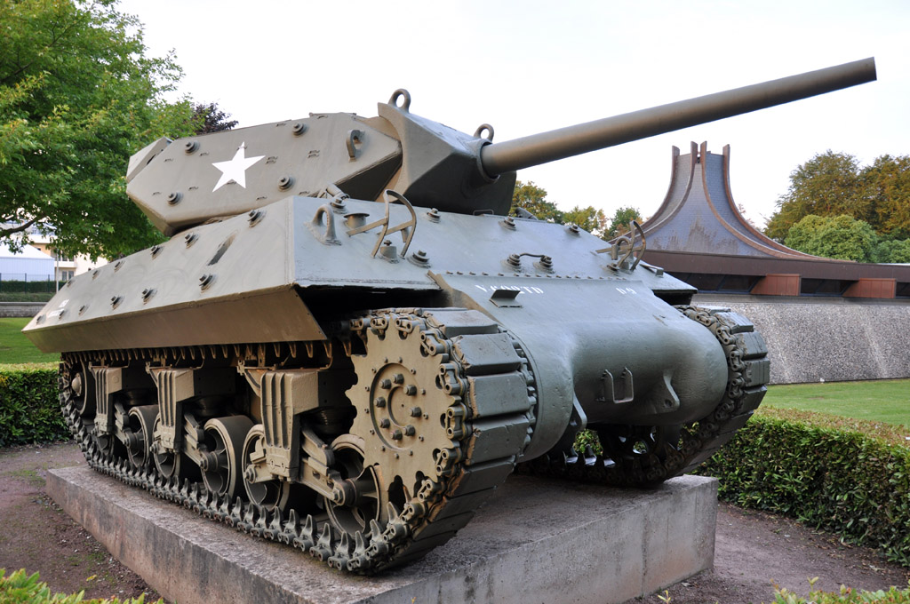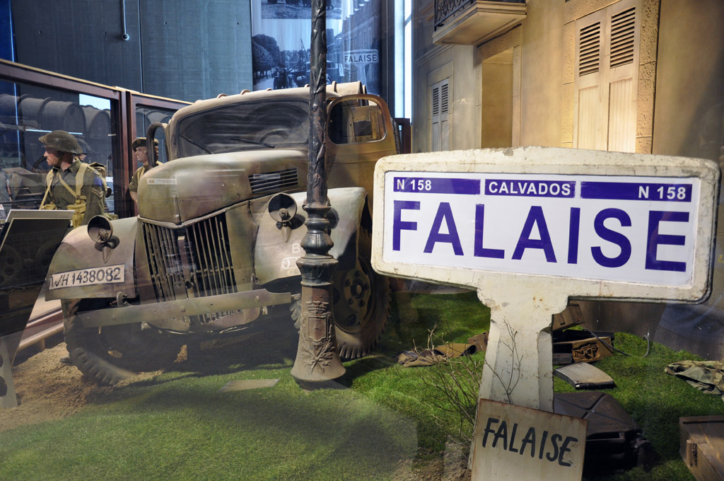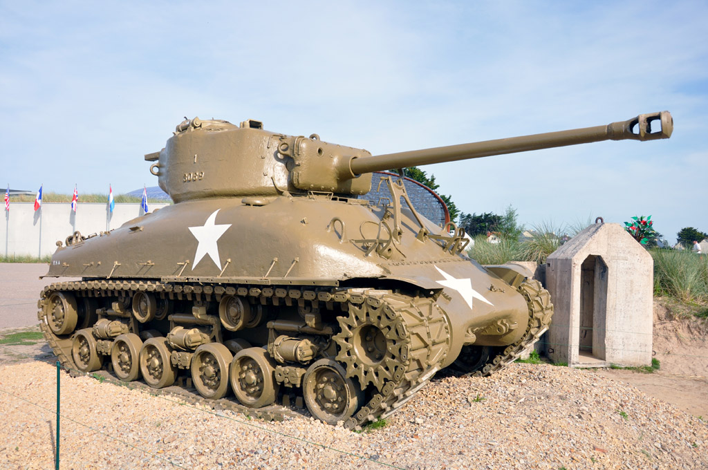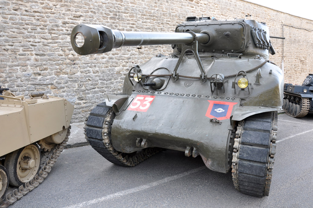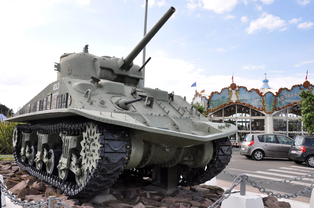 Nous repassons ensuite devant le musée de Saint-Laurent-sur-Mer, devant lequel est exposé ce Sherman à la patine très prononcée, puis devant le nouveau musée Overlord à Colleville-sur-Mer (relocalisation de l'ancien Musée de la poche de Falaise), où ce Sherman, ce TD M10 et ce Sexton prennent place.