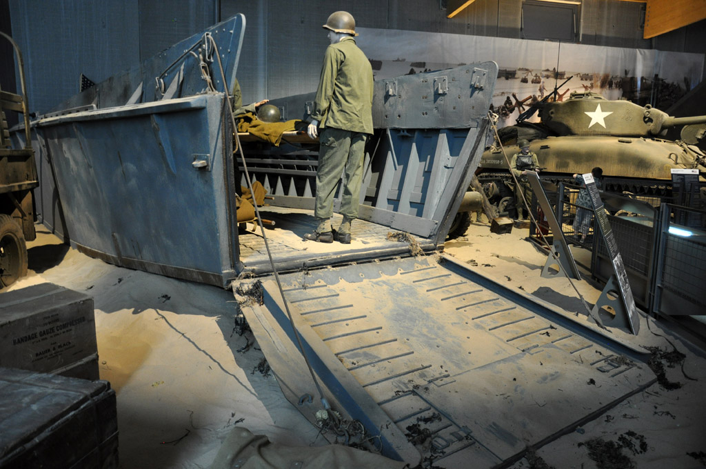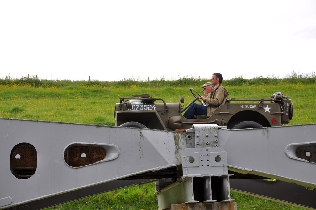 Nous voyons encore quelques véhicules, comme ces Black Hawks, ce Dodge WC60 ou cette Jeep sur un pont flottant à Vierville-sur-Mer.