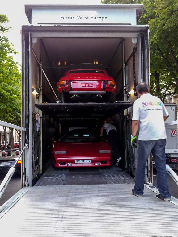 Les 20 et 21 juin 2015, la maison de vente aux enchères Artcurial organisait pour la 8ème fois au sein de ses bâtiments situés sur les Champs-Elysées, la vente "Automobiles sur les champs". J'ai pu assisté, presque par hasard, à l'arrivée des voitures le vendredi soir. A peine arrivé, de nombreuses voitures sont déjà sorties des camions et attendent leur entrée dans le parking abritant l'exposition.