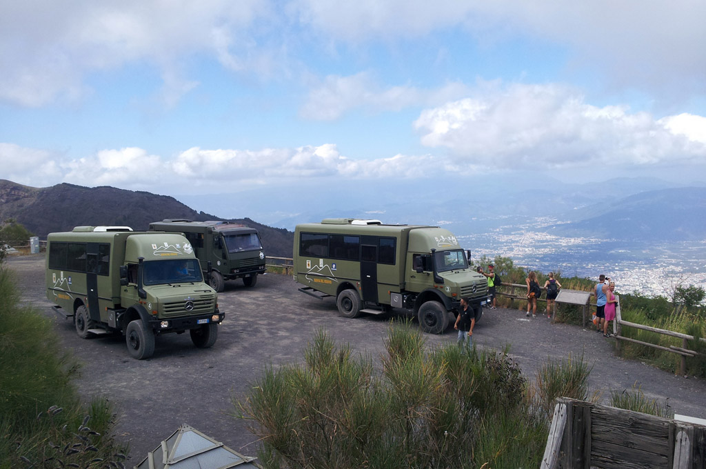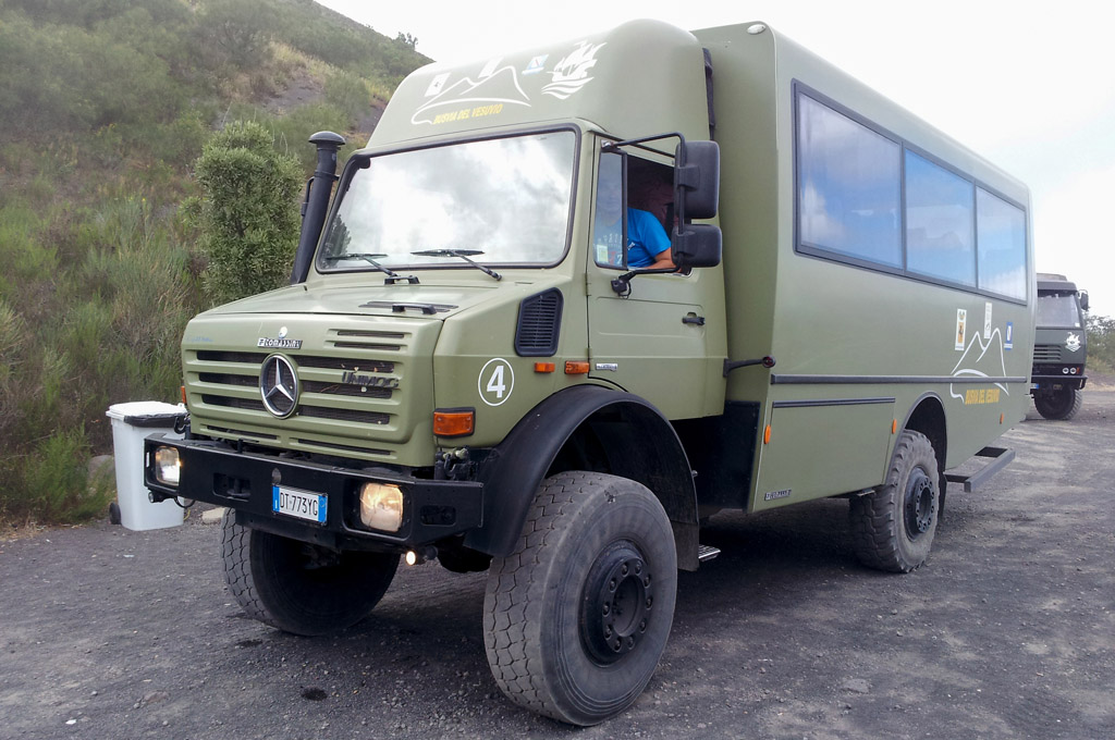 Cette été, je suis parti une semaine à Naples en Italie. Se situant juste à côté de Pompei et du Vésuve, une visite s'imposait. Quelle ne fût pas ma surprise de voir qu'un des transporteurs menant en haut du volcan faisait la montée en Mercedes Unimog ! La première partie, de Pompei aux premiers mètres du Vésuve, se faisait dans un bus vétuste ayant toutes les peines du monde à finir l'ascension de la route. Puis on échangeait pour faire la suite en Unimog, qui n'avait aucune difficulté à monter la piste abrupte et rocailleuse du volcan. Les derniers mètres devaient ensuite se finir à pieds. Un autre camion, que je n'ai su identifier accompagnait les Unimog.