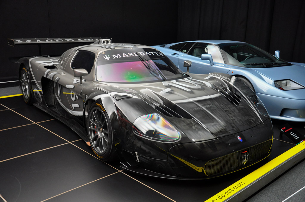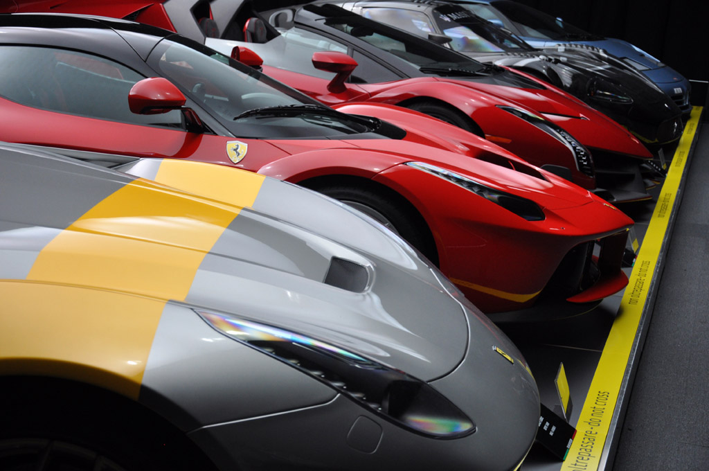 On y retrouve ici les grosses têtes d'affiches modernes de l'exposition : une Ferrari F12 Berlinetta à la robe personnalisée rappelant les couleurs de voitures de course des années 60, une LaFerrari, la Veneno Roadster (quel monstre ! Je ne suis pas sûr d'appécier...), une Maserati MC12 Corsa, ainsi qu'une Bugatti EB110 (certes, la marque Bugatti est française, mais à l'époque de l'EB110, elle avait été rachetée par un entrepreneur italien). Ce n'est pas un alignement que l'on voit tous les jours !