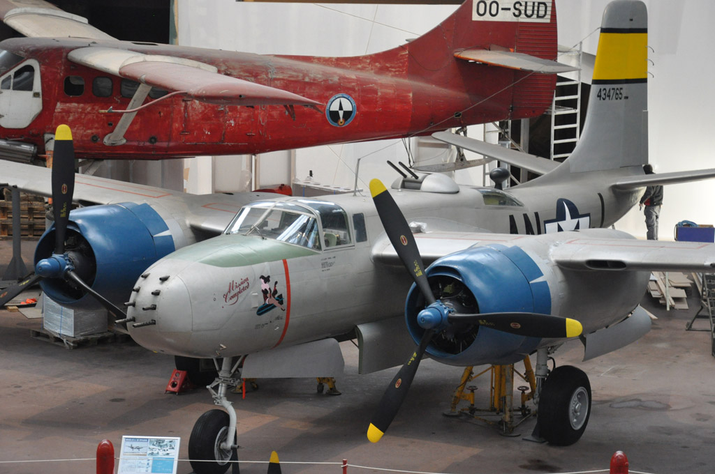 Nous passons ensuite au hall des avions qui sera finalement la meilleure partie du musée. Contrairement à la dernière visite, nous avons pu monter à l'étage et admirer les différents aéronefs d'en haut. Entre autres : DC3, Junkers Ju-52, A26, Spitfire, Seaking, F84,...