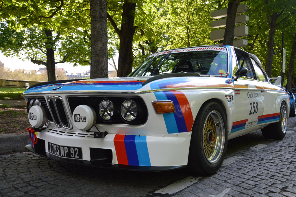 Plusieurs véhicules sont stationnés sur le bas côté, en attendant de pouvoir rentrer dans le bâtiment : Porsche 911 Carrera RSR, une réplique de 911R, Alfa Romeo Giuletta SS, Sisata 208 S, ou ces BMW 3.0 CSL.
