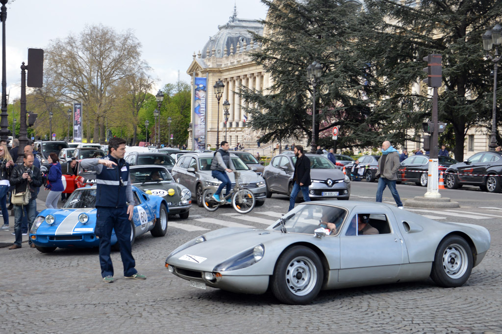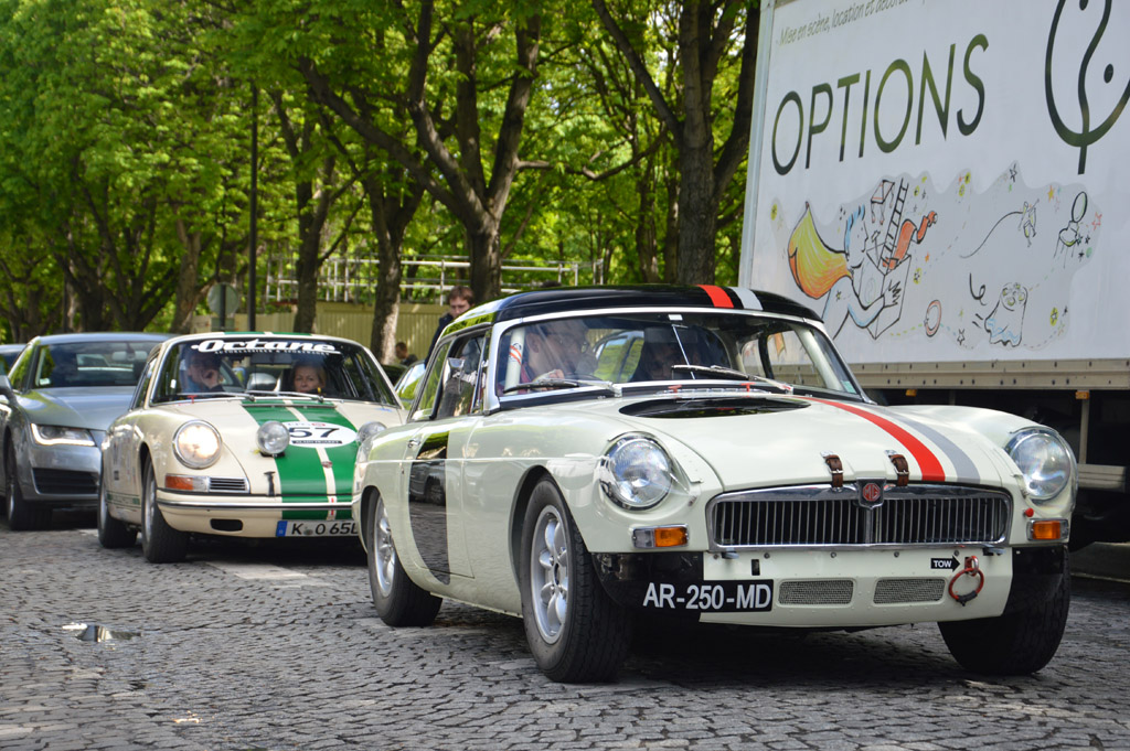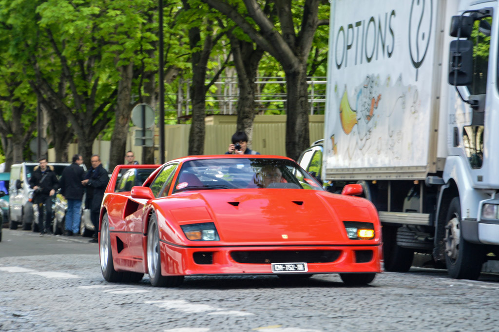 Le long du Grand Palais, plusieurs concurrents passent, comme cette MG B ou cette Alfa Romeo 1300 SZ, mais surtout ce spectateur en Ferrari F40 !