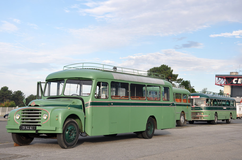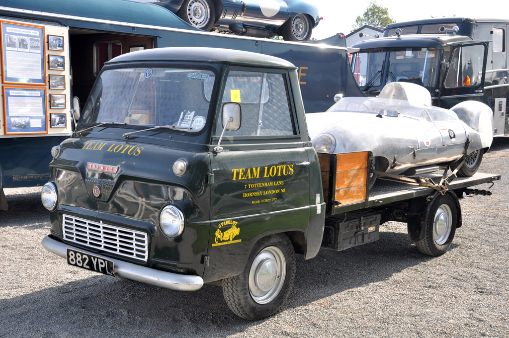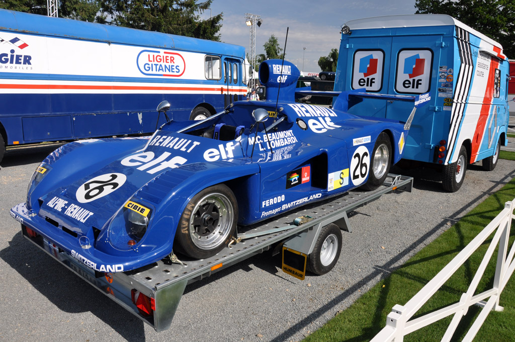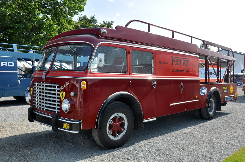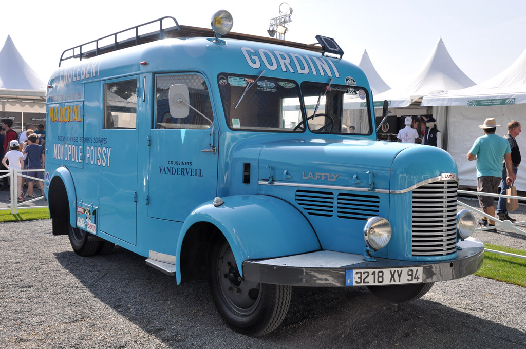Un peu plus loin, une exposition est consacrée aux transporteurs d"poque : Ford Thames du team Lotus, Commer TS3 de l'écurie Ecosse, Fiat Bartoletti associé à Ferrari, Laffly d'assistance pour Gordini ou ce Saviem transport d'une Alpine A441.
