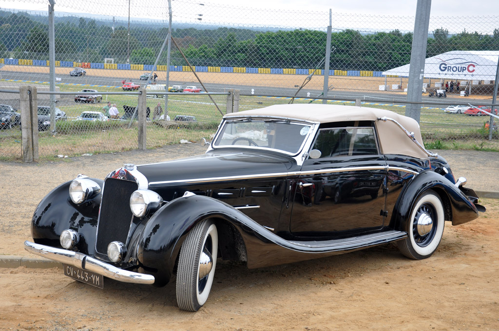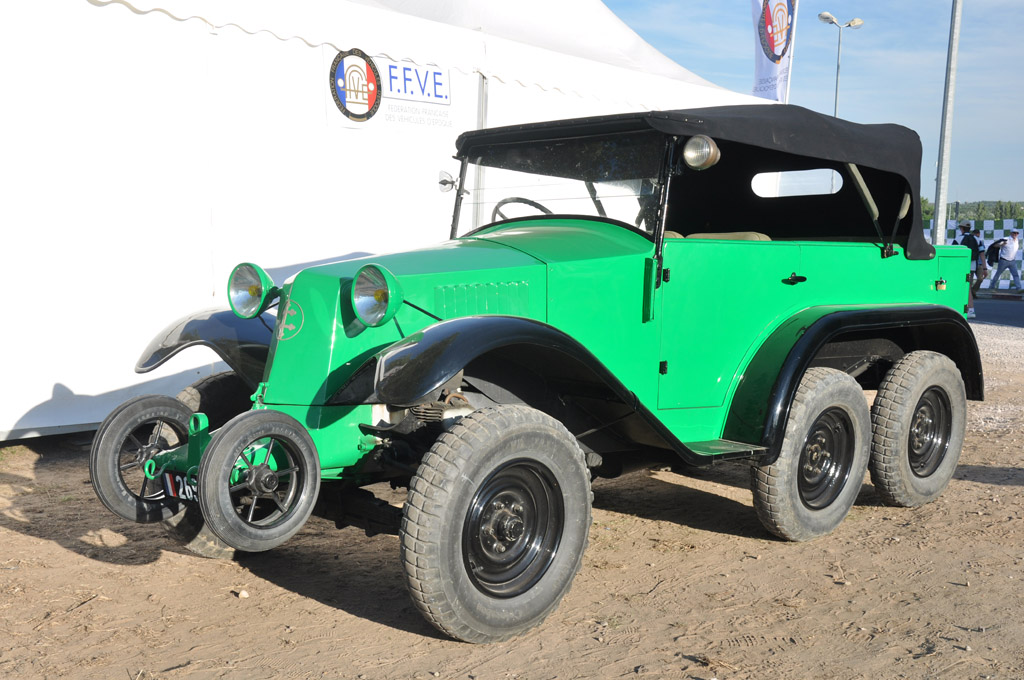 Passage par le village "Le Mans", où une sorte de village à l'acienne est reconstitué. De nombreuses moto vintage font partie du décors. Egalement insolite, cette Lorraine-Dietrich à 6 roues.
