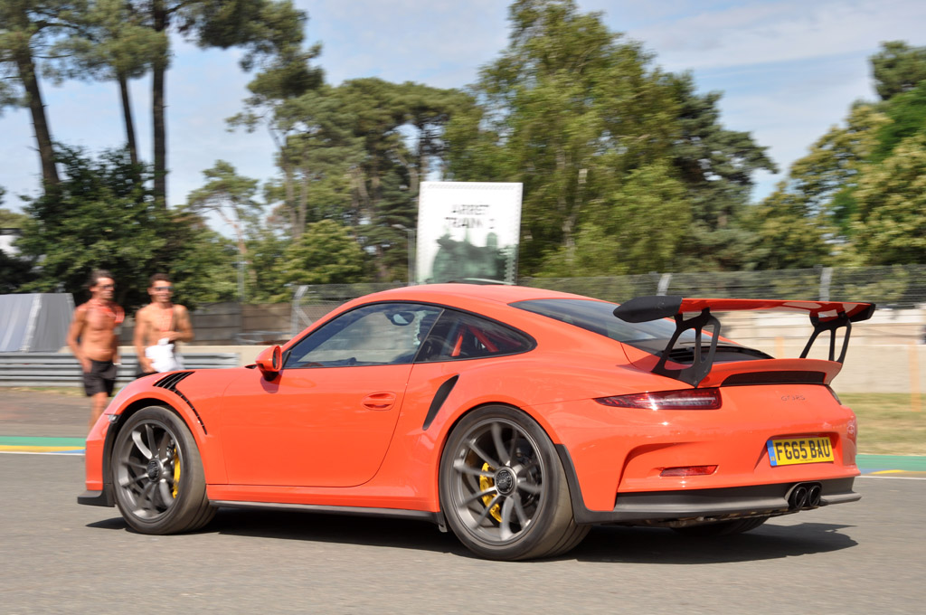 Le lendemain matin, nous revenons sur le parking un peu avant 8h. Le parking offre toujours de belles surprises : Lamborghini Murcielago ou cette rare Cadillac Station Wagon. Nous empruntons ensuite les navettes pour gagner le circuit. Devant l'entrée, cette splendide GT3 RS était stationnée.