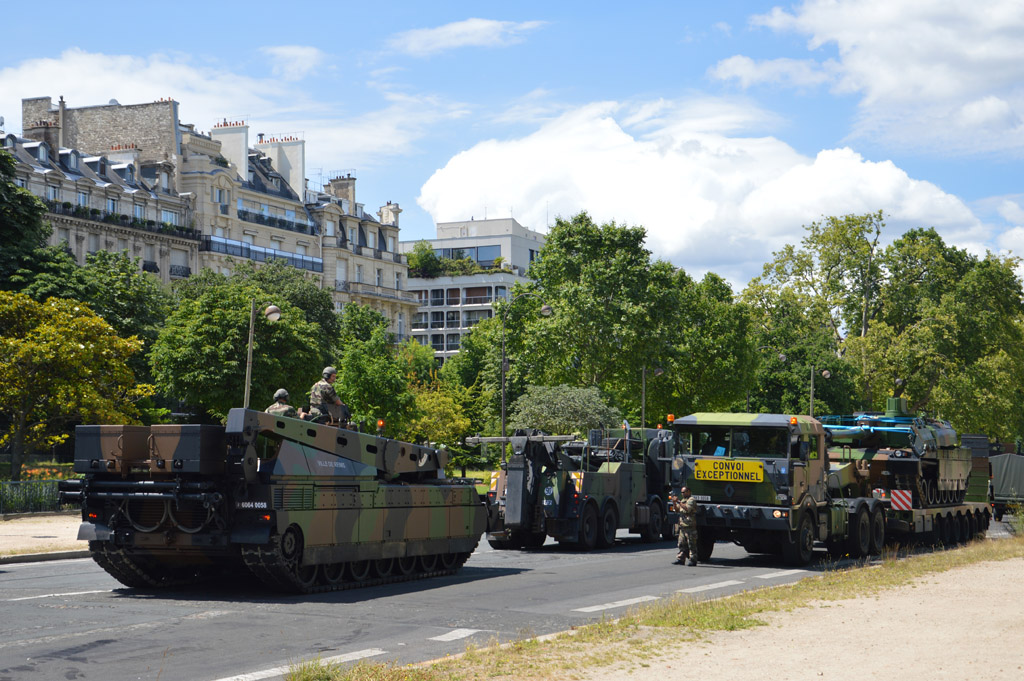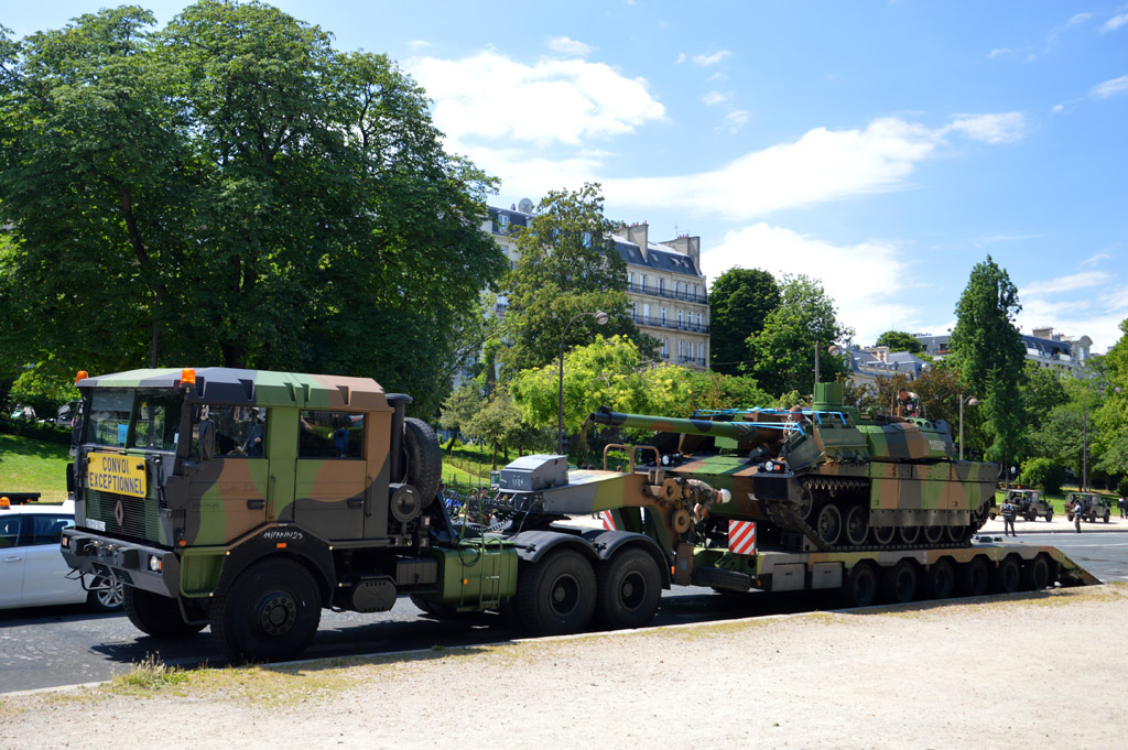 Puis dérrière l'Arc de Triomphe, sur l'Avenue Foche, je retrouverai les Leclerc, accompagnés des MLRS. Tous les véhicules chenillés semblent être rassemblés ici, et quasiment tous sont déjà rechargés sur leur remorque. J'assisterai tout de même au rechargement du dernier arrivé sur son Renault TRM-700-100 (la vidéo est à voir ici).