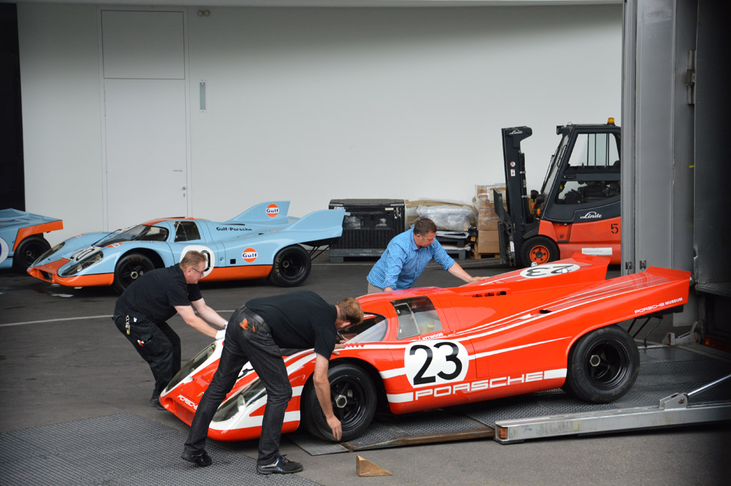 Je décide donc de reprendre le train. Alors que j'attends sur le quai d'en face, du côté du musée, la porte d'un camion de transport s'ouvre et j'aperçois le museau d'une 917 Gulf ! Je décide donc d'approcher un peu plus près pour voir tout cela et j'assisterai au déchargement de cette deuxième 917 avant que la première (en réalité ce n'est pas celle qui a gagné le Mans en 1970, mais bien une vraie 917 d'usine qui en porte la livrée, l'originale étant aux mains d'un collectionneur privé) ne prenne sa place dans le camion. Heureusement que le train n'est pas arrivé tout de suite, j'aurai râté ça !