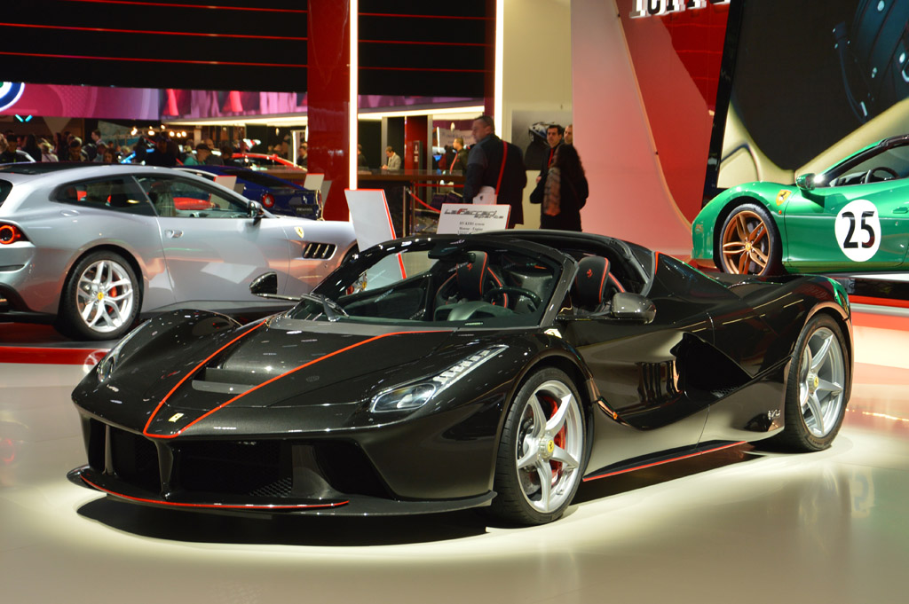 On passe chez les italiennes et on commence avec le stand Ferrari qui aura ramené l'une des seules choses un peu intéressantes du salon : la LaFerrari Aperta, la version découvrable de l'hypercar de la marque. Autre présentation, celle de la GT4C Lusso T, la version V8 turbo du break de chasse Ferrari. Les autres modèles de la marque étaient présentés dans une livrée spéciale marquant le 70ème anniversaire de Ferrari : 488 Spider, F12 Berlinetta et California T.