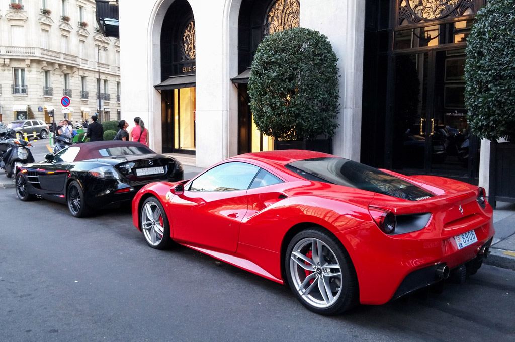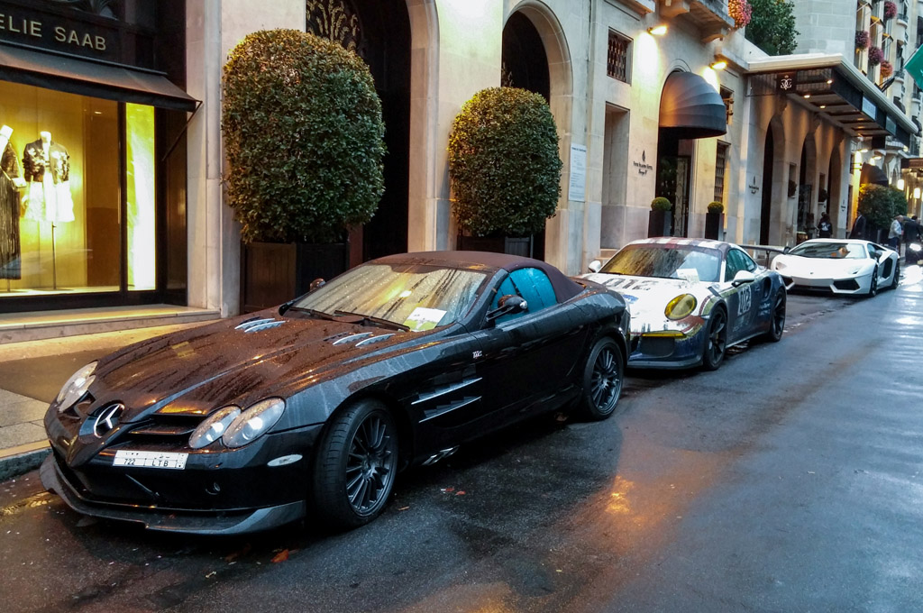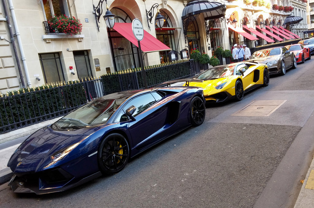 Et encore une impressionante lignée devant un des hôtels de luxe : Mercedes-McLaren SLR 722S Roadster, deux Ferrari 488 GTB, Ferrari F12, Rolls-Royce Wraight et Ghost ou Lamborghini Aventador SV.