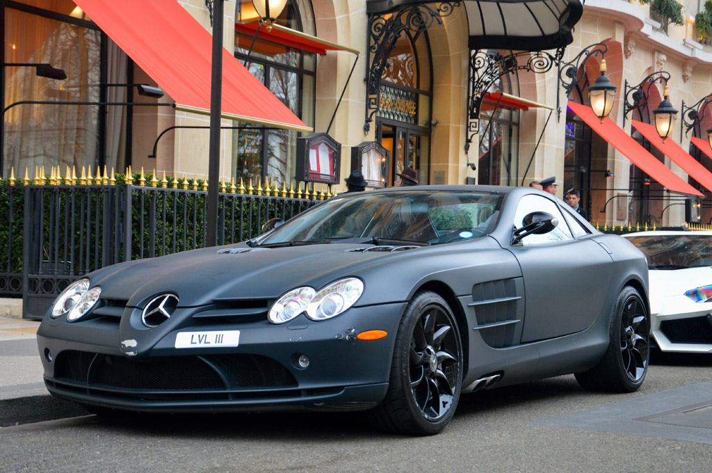 Autre supercar peu courante, cette Mercedes-McLaren SLR équipée d'un film noir mat, accomapgnée d'une Lamborghini Aventador blanc nacré.